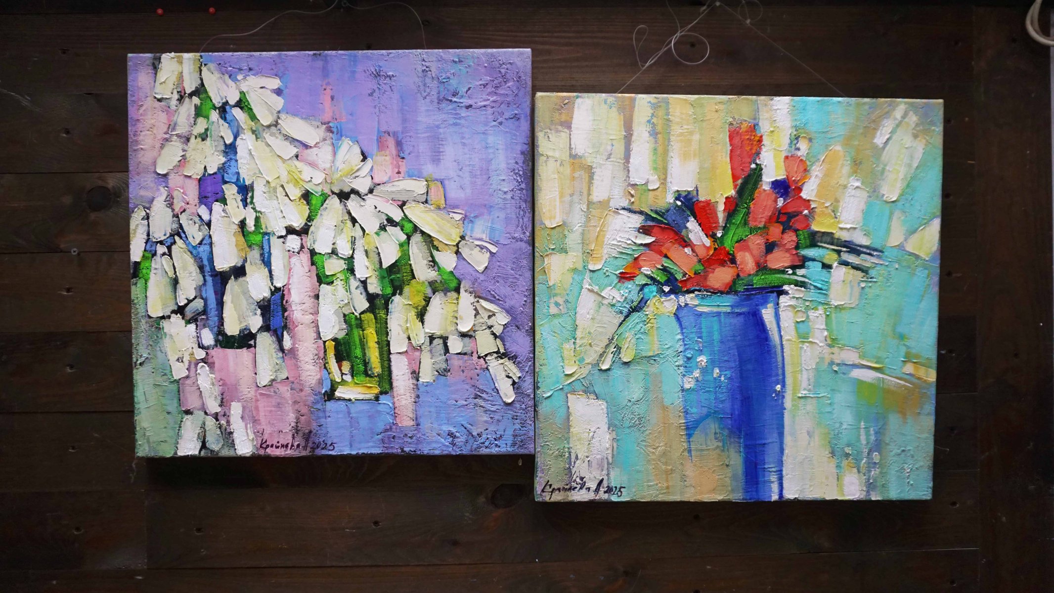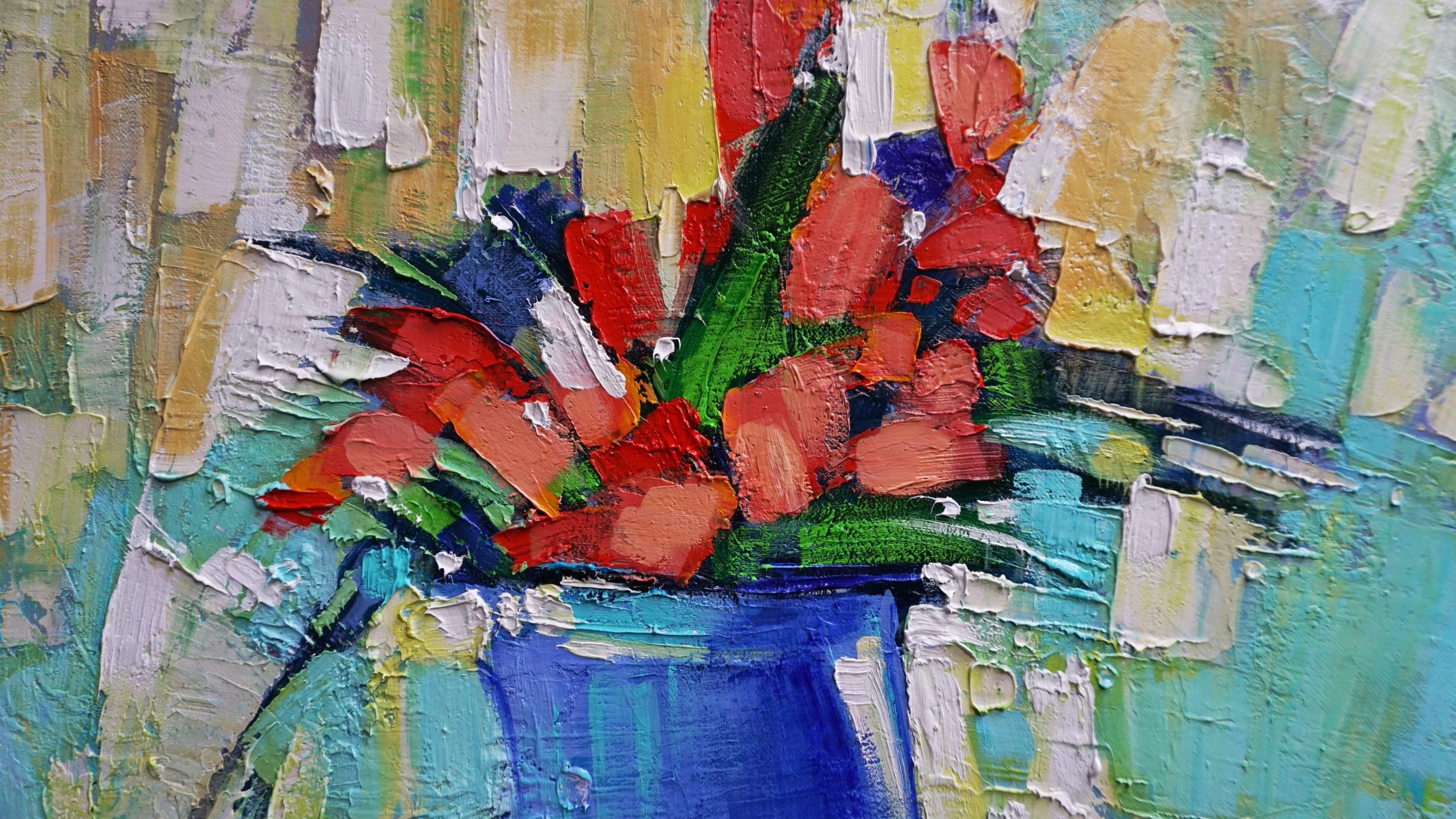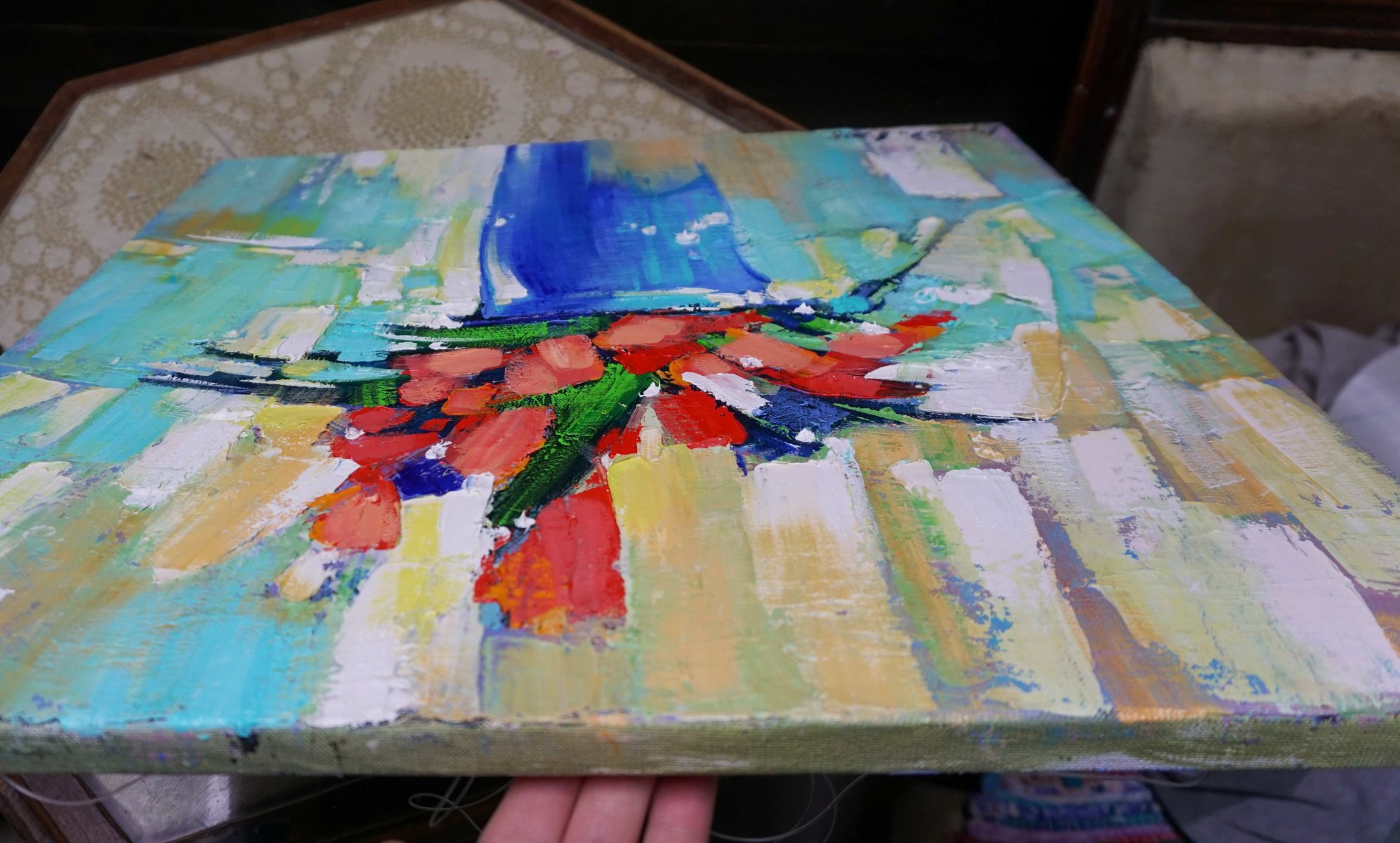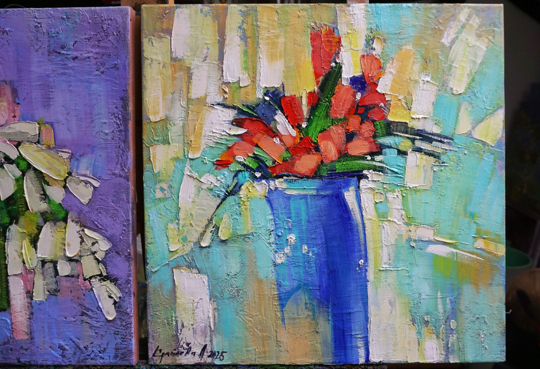 In this vivid expression, I used thick, textured strokes of oil to capture the dynamic interplay of light and color. The bouquet, a burst of warm reds and oranges against the cool, serene blue of the vase, symbolizes vitality and passion amidst tranquility. The composition, influenced by expressionism and impressionism, conveys a sense of renewal and awakening. This artwork radiates energy, bringing an invigorating presence to any space, enriching it with a feeling of a fresh, vibrant spring morning. Spring morning. Spring flowers.