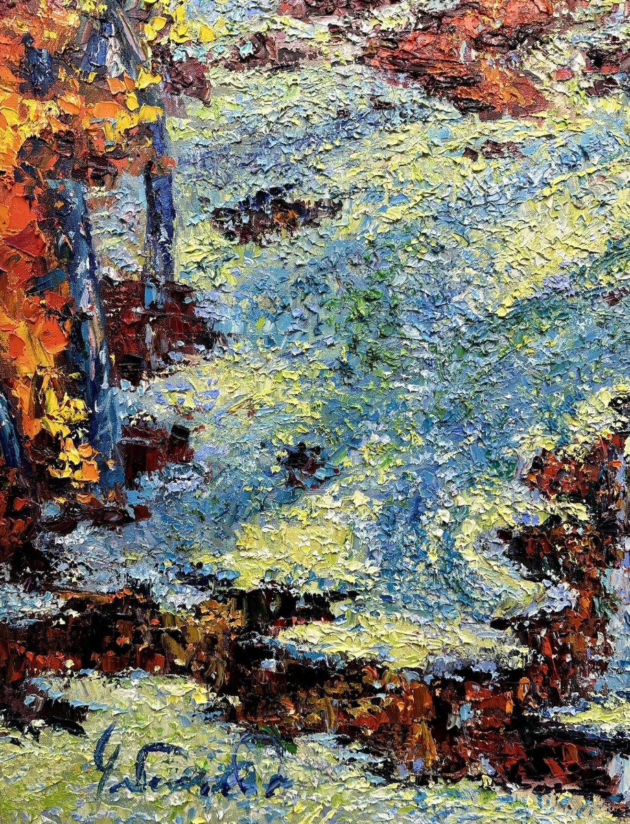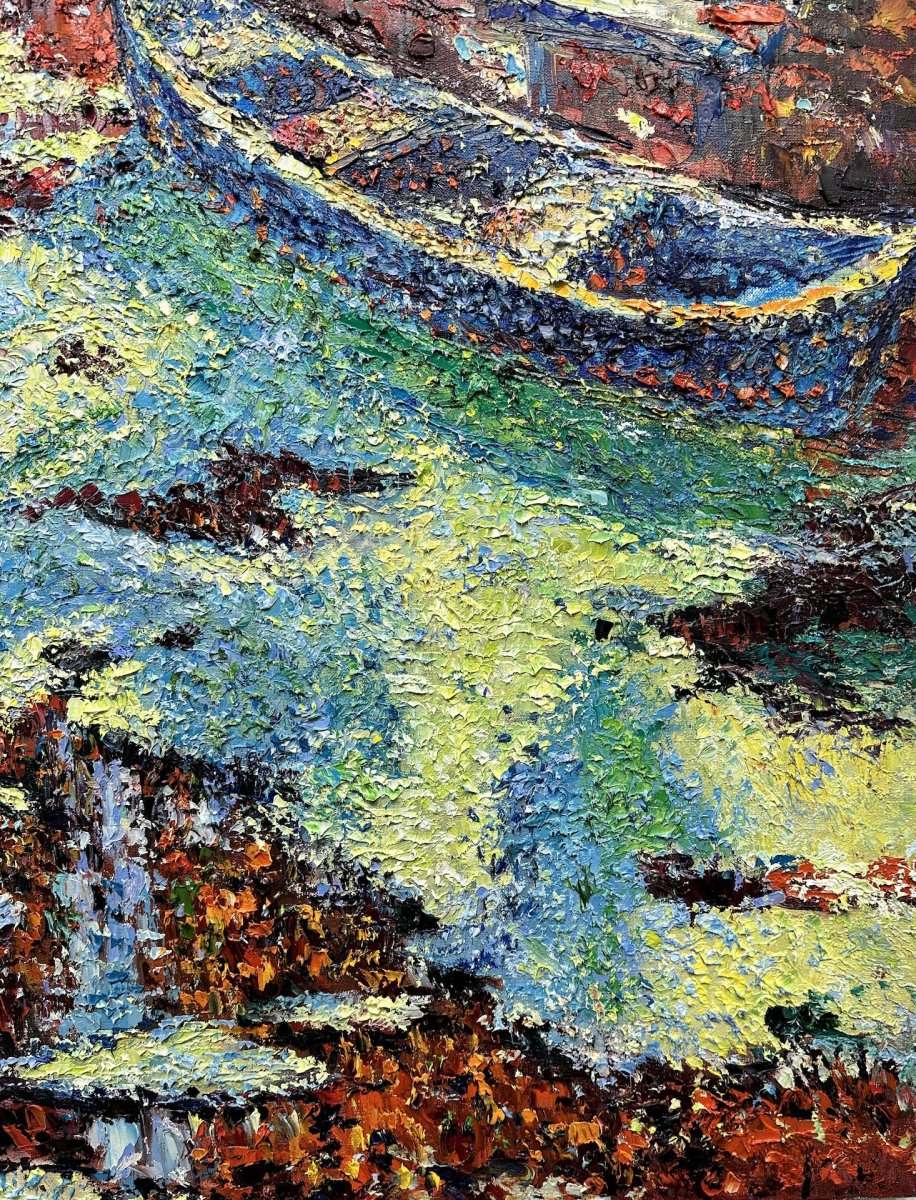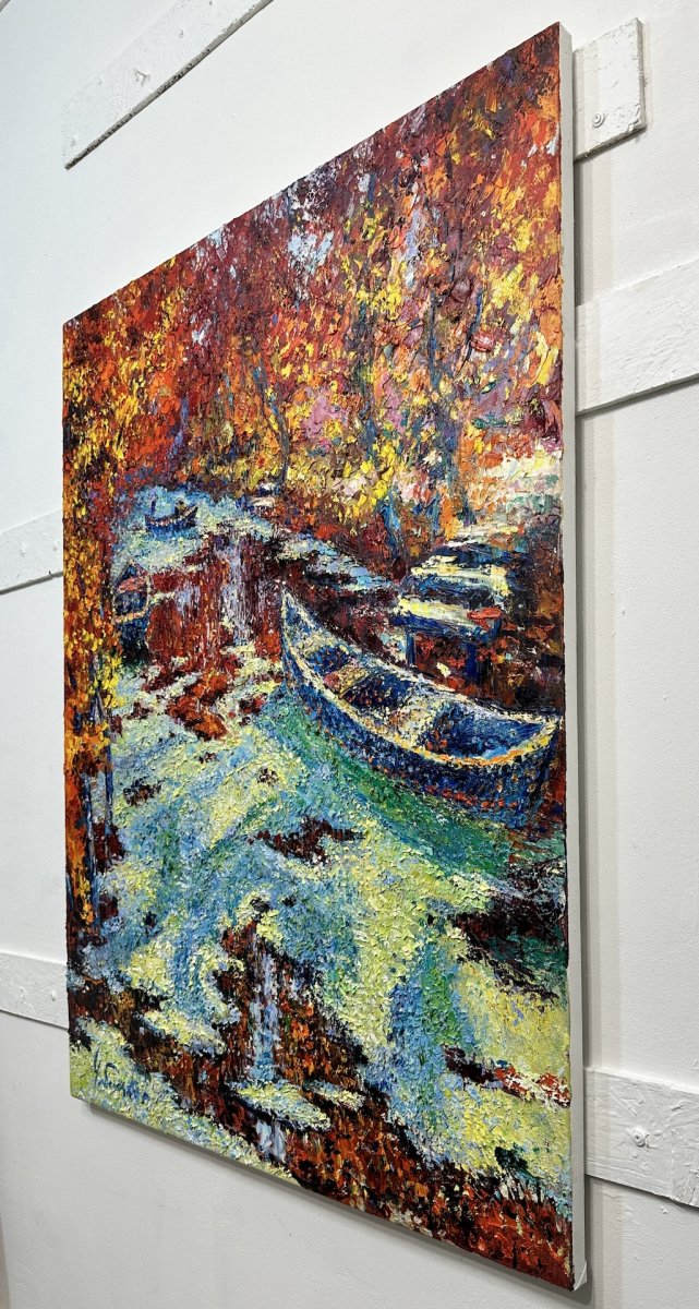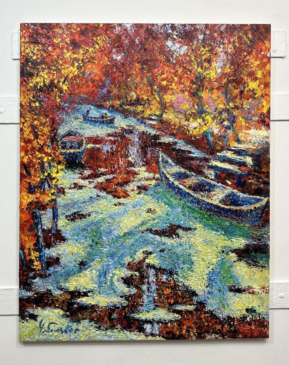 “Ukrainian Venice” captures the unique charm of Vylkove, a town built on water and canals. Expressive impasto brushstrokes and glowing autumn colors create a dynamic rhythm between boats, reflections, and foliage. The painting conveys movement, warmth, and the poetic harmony of nature and human presence in this vibrant Ukrainian landscape.