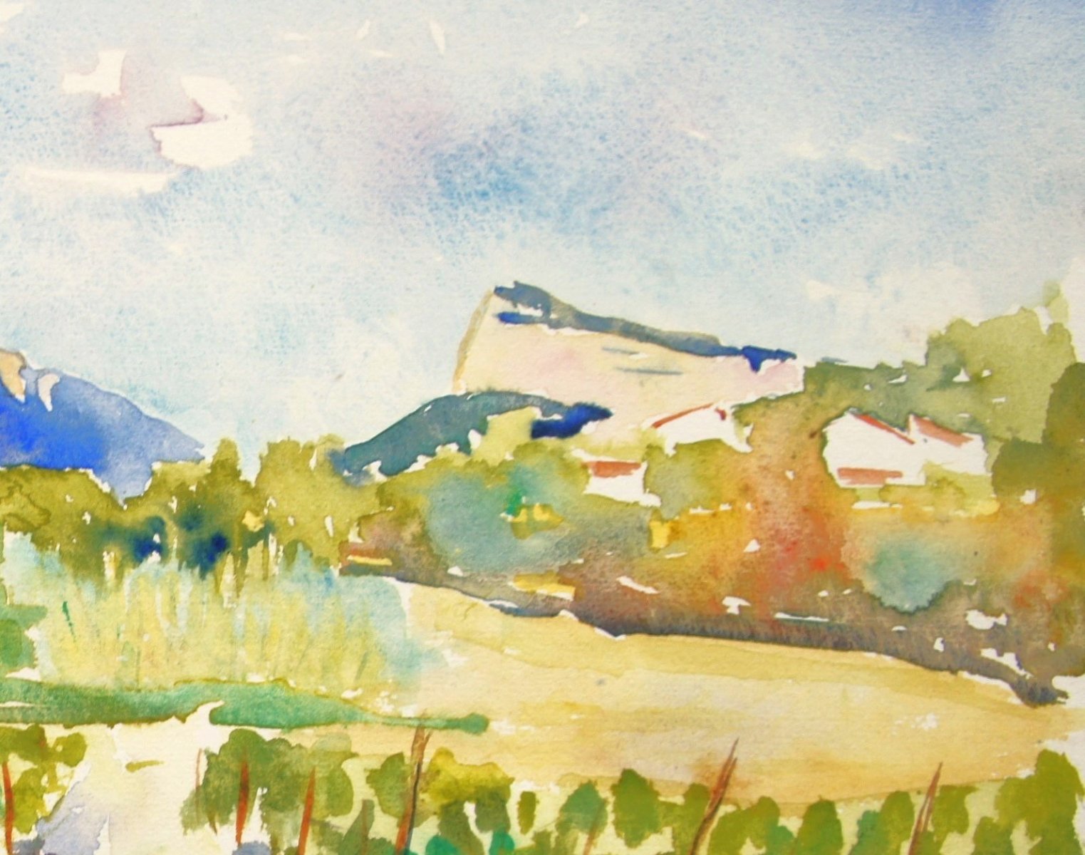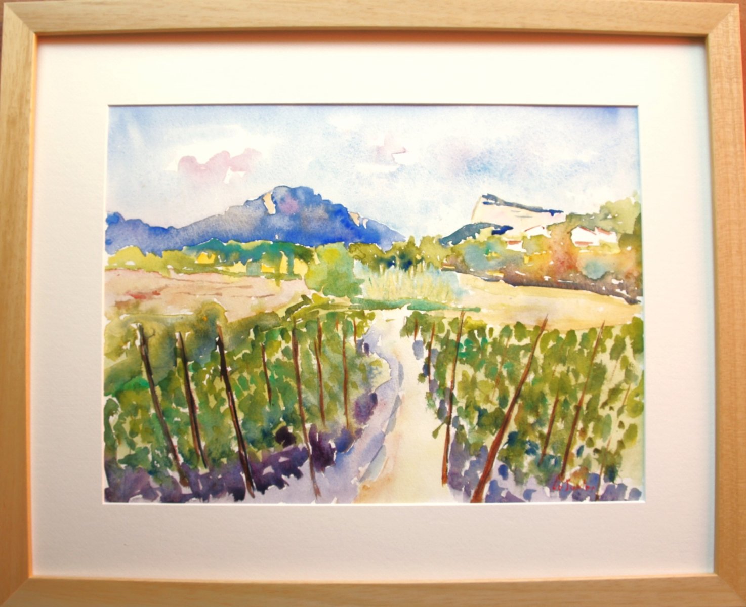 This watercolor was made in-situ on a wine estate called 'Chäteau Lancyre' , near the village of Valflaunès (Hérault). It showcases the iconic Pic Saint-Loup and Hortus mountains which can be seen in the background. The Pic Saint-Loup gave its name to a famous wine appellation (Its vinyards can be seen in the foreground)..