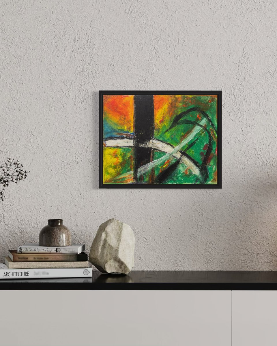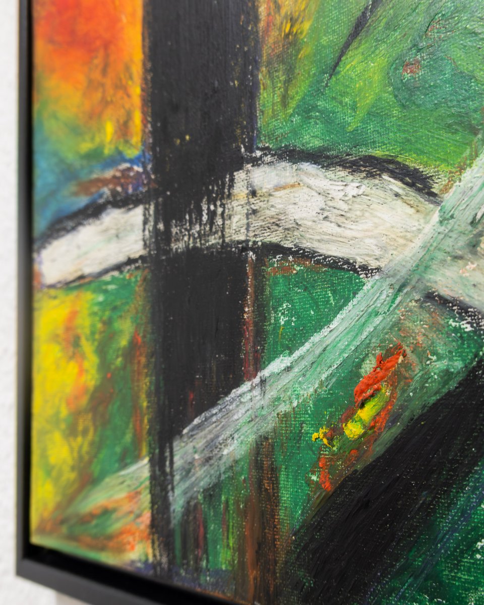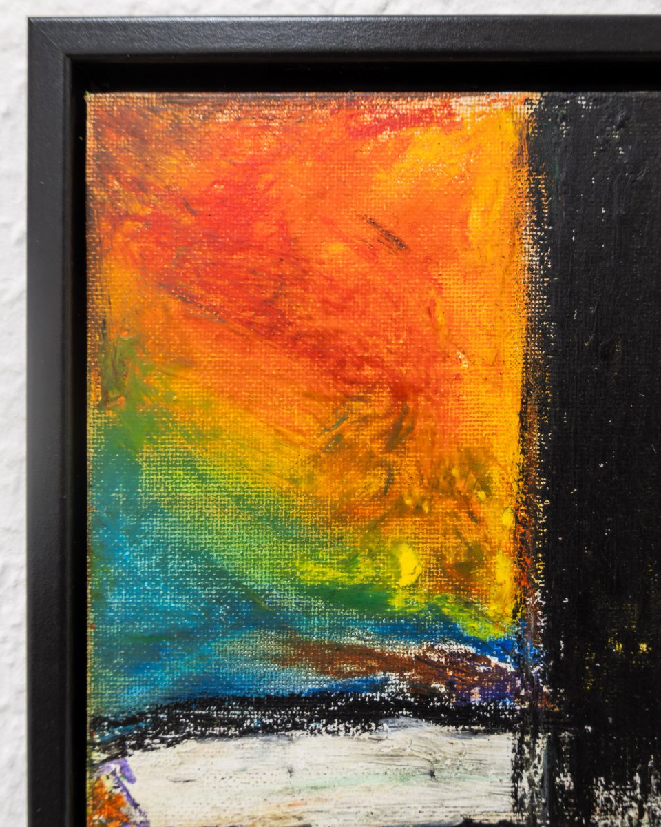 Die Farbklänge von Grün, Orange und Schwarz scheinen von Erde und Himmel zugleich zu stammen und tragen die Ruhe wie auch die Unbeständigkeit des Nordens in sich. So entsteht ein Originalkunstwerk, das keine Landschaft abbildet, sondern sie erinnert – eine poetische Verbindung auf kleiner Fläche von Struktur und Empfindung, inspiriert von der Atmosphäre Sylts.