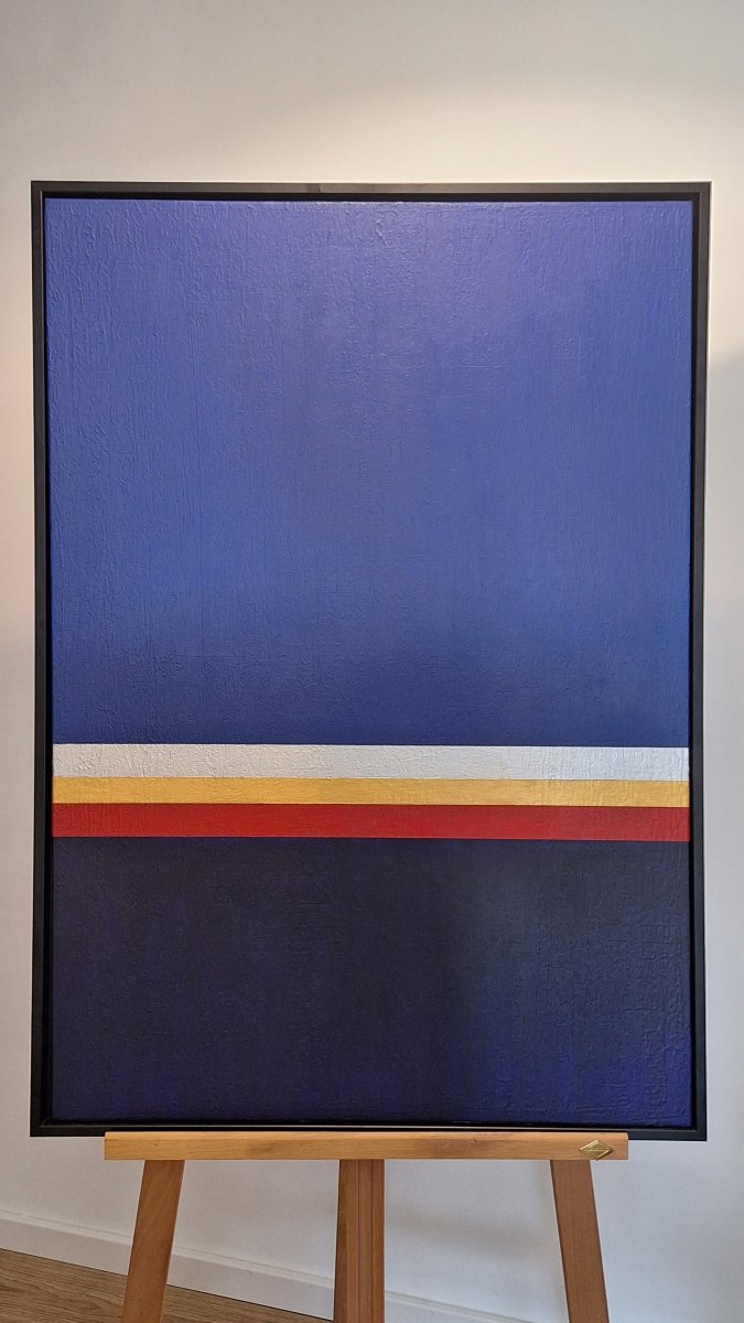 In this painting “Horizon,” the artist explores the intersection of stillness and movement—where the colorful fields become a quiet dialogue between earth and sky. Horizontal stripes of red, gold, and silver run through the dark blue, symbolizing transition, light, and the passage of time. The work invites the eye to find balance and contemplate the vastness of abstraction.