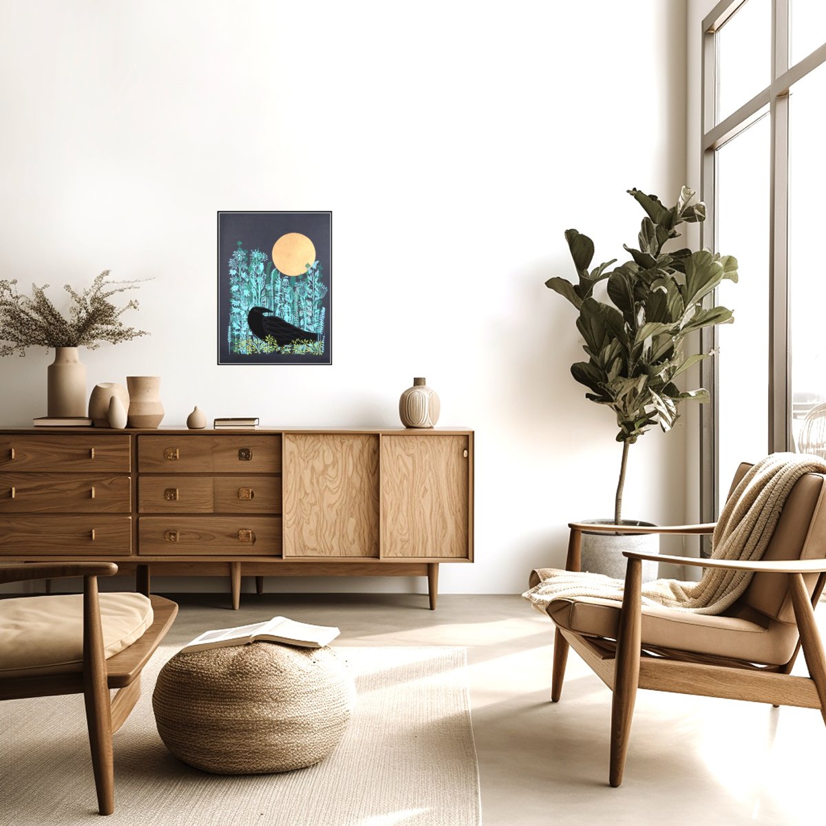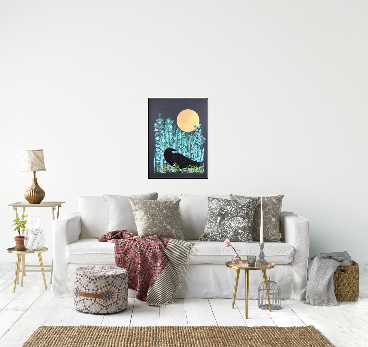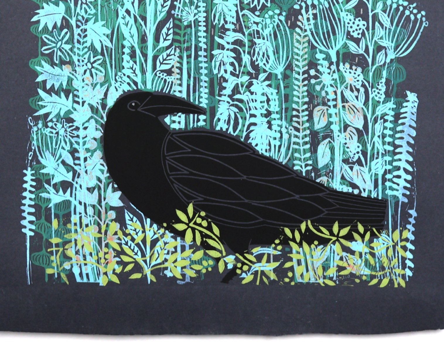 on a piece of beautiful handmade black paper, with 4 deckled edges, I have printed the Raven in black and the Moon in gold. Once dry I add the flowers in moonlit colors. These monoprints go through the press several times as I overlap and add the flowers until I have the result I want. Handmade paper has a tendency to undulate a bit, and when put through the printmaking press this can make for a bit of cricking of the paper.