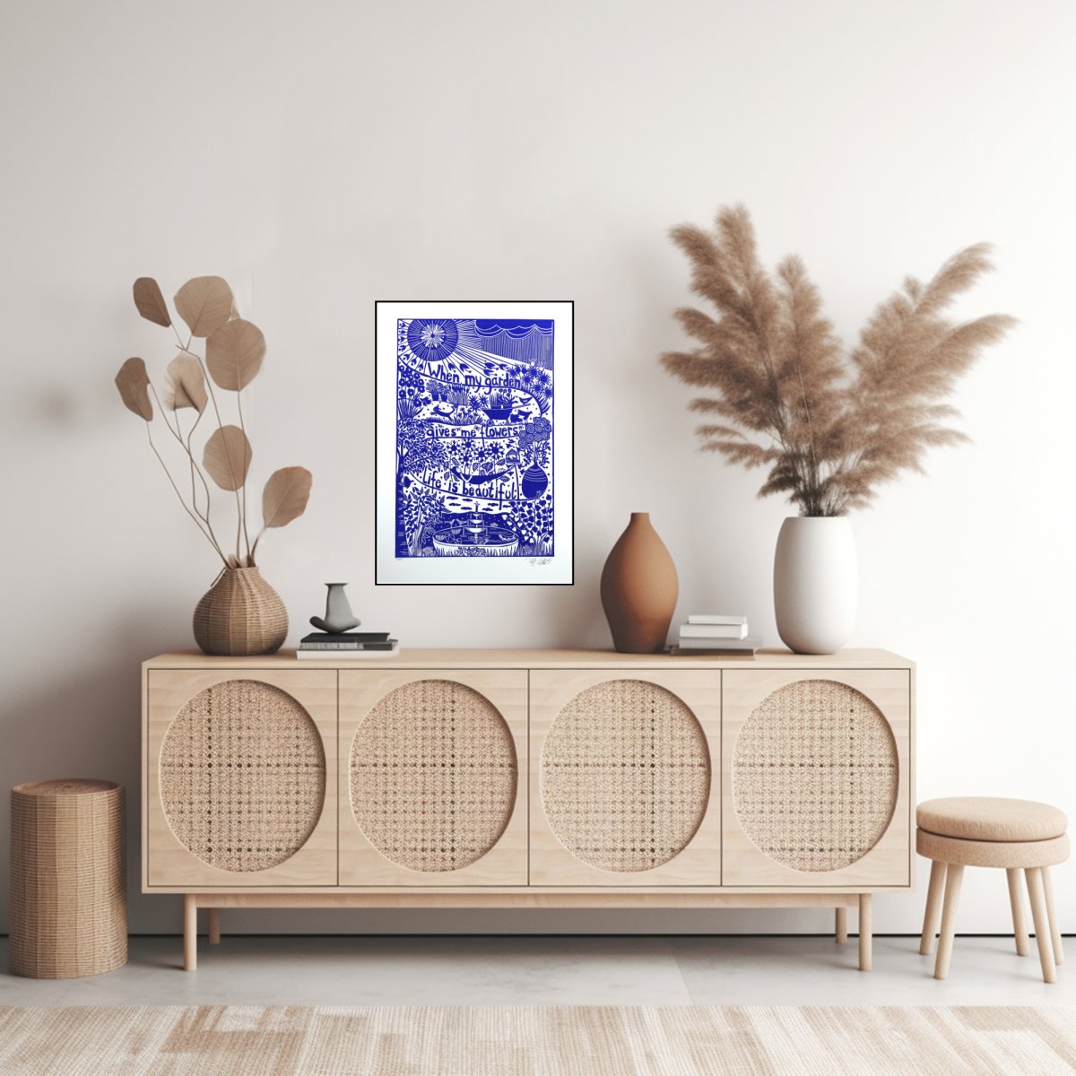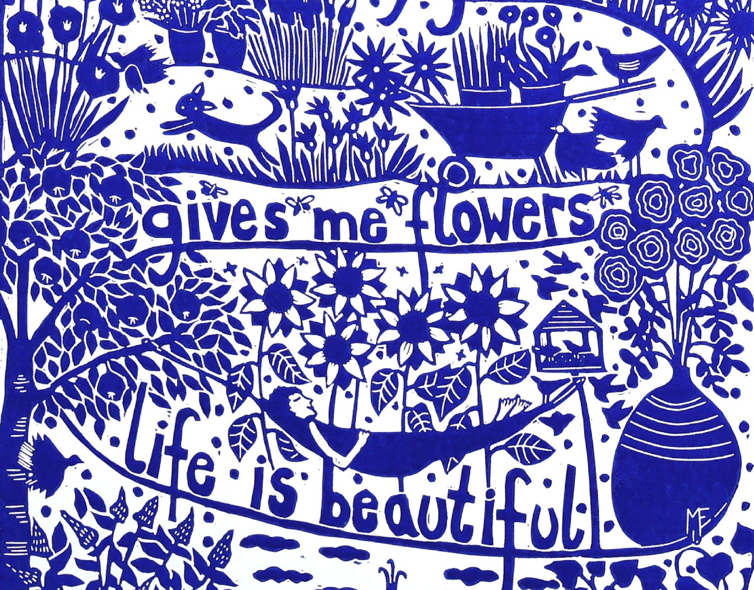 A large blue and white (you can ask me to print in other colors) linocut looks deceptively simple, but can actually be right there with the most difficult, to make an image really work when you only have 2 "colors" means you have to look at things in a different way. I use a fantastic paper, crisp white with a velvety surface, and the best waterbased ink.