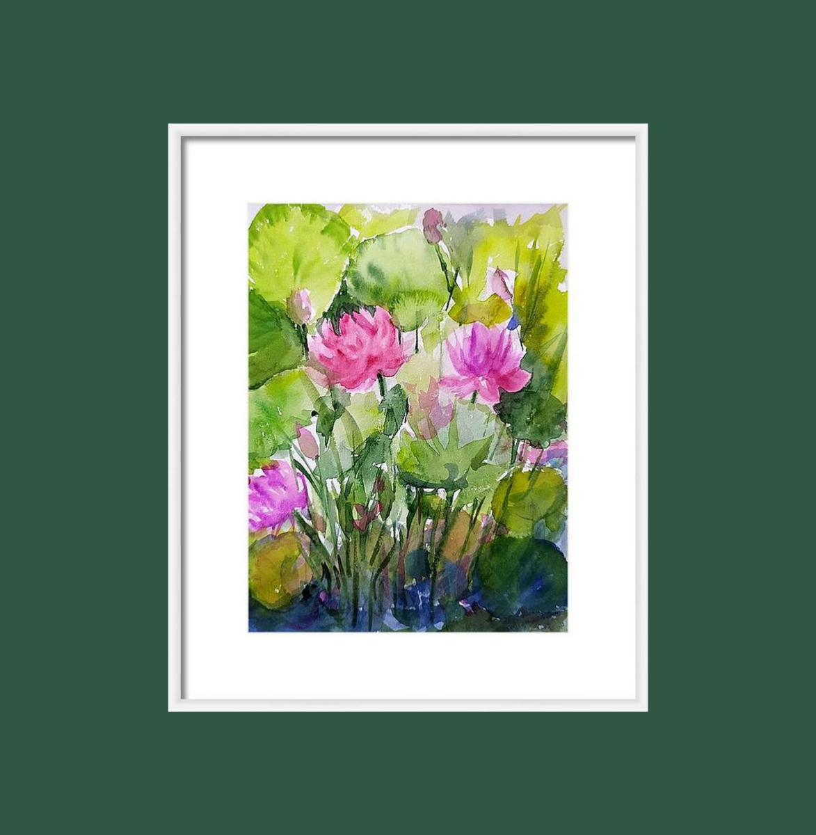 This watercolor floral art features stunning pink water lilies in a serene garden pond. With its calming and meditative quality, this Zen painting can transport you to peace and tranquility. Gaze upon it and you may even hear the soothing sounds of silence. As per Feng shui it can turn bad luck into good luck and signifies enlightenment and pure energy. Feng shui experts highly recommend water lilies for home decorations, especially in the living room.