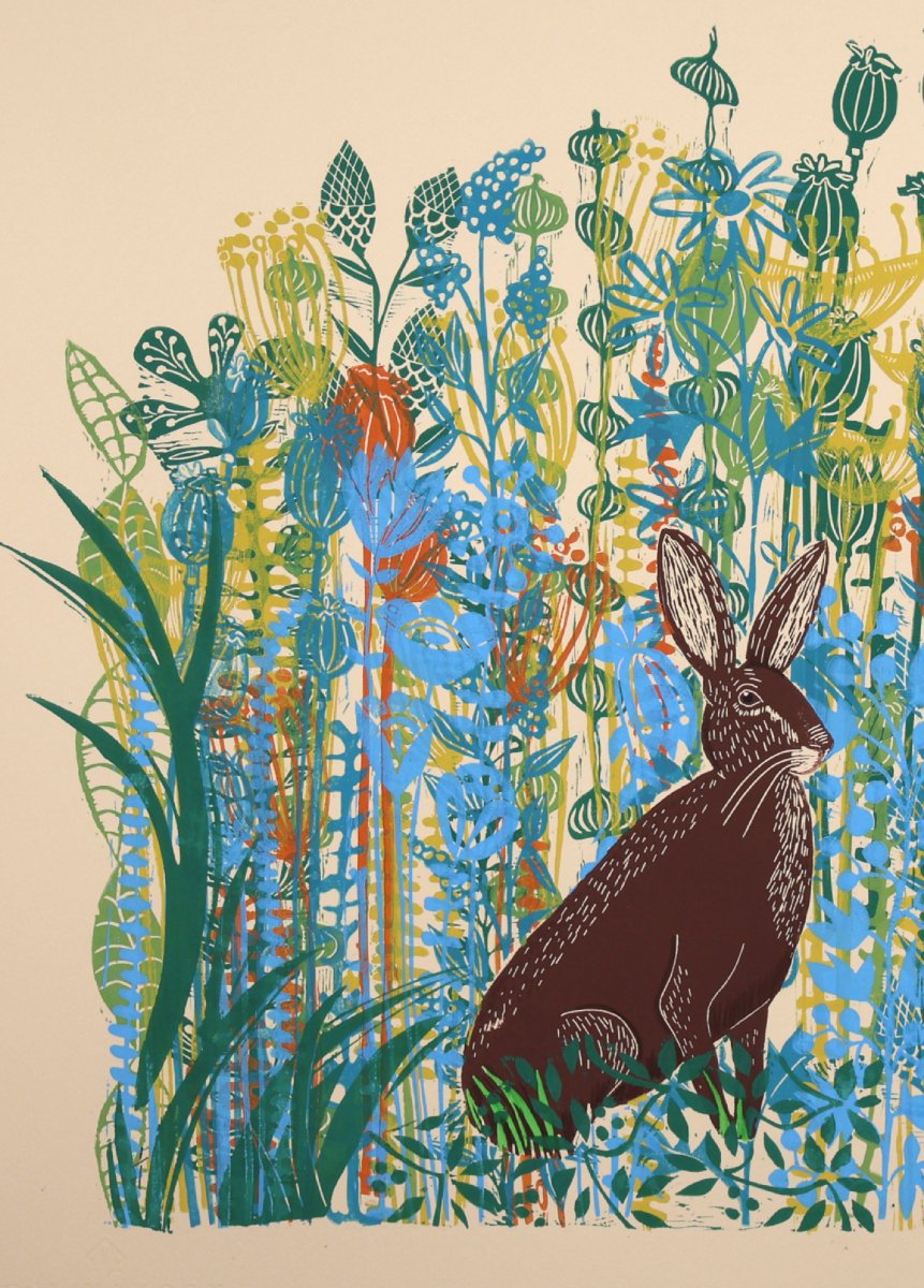 on a piece of warm cream best quality printmaking paper, I have printed the Hares first and then layered my flowers, printed from all my own linocuts onto the paper in several runs through the printmaking press. I print up to 6 different layers to get the result I want. As these prints all come out different I have signed it as a monoprint.