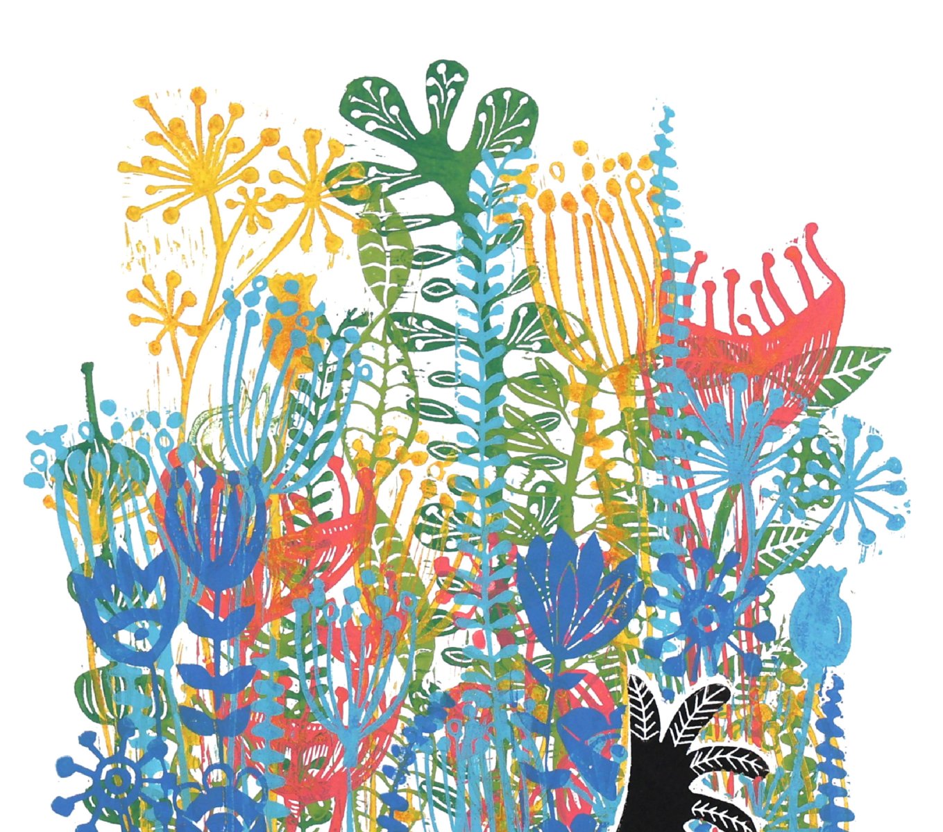 On a piece of lovely white best quality printmaking paper, I have printed the little hen and then layered my flowers in joyful colors, printed from all my own linocuts onto the paper in several runs through the printmaking press, the composition part is the greatest fun, to make it beautiful. As these prints all come out different I have signed it as a monoprint. When the print has dried I have added details in ink and colored pencil.