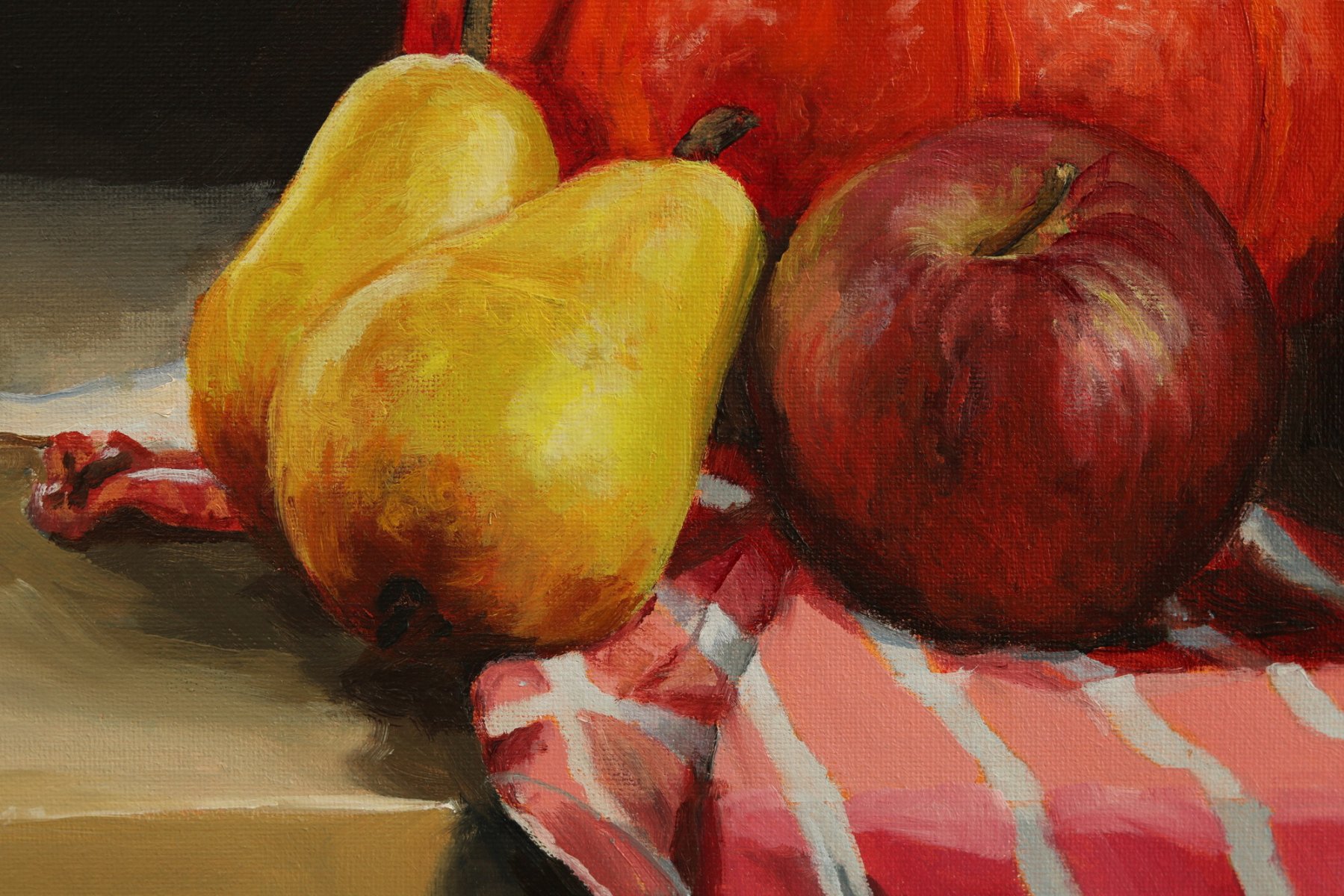 The photos are of the painting before varnishing (to avoid reflections). Now it has been varnished, the colours are the same but deeper and more vibrant.