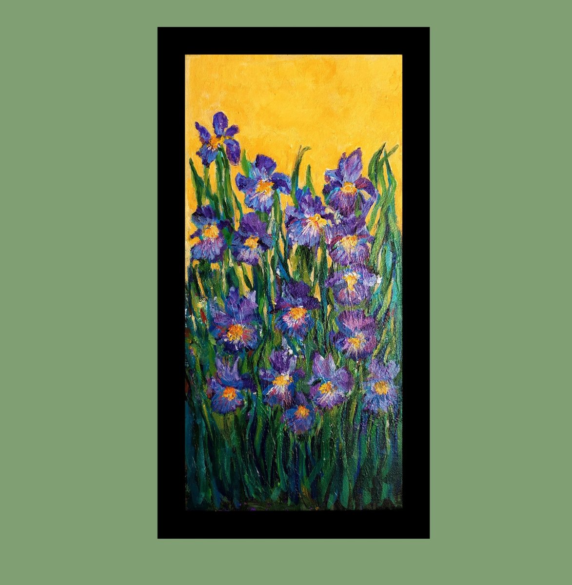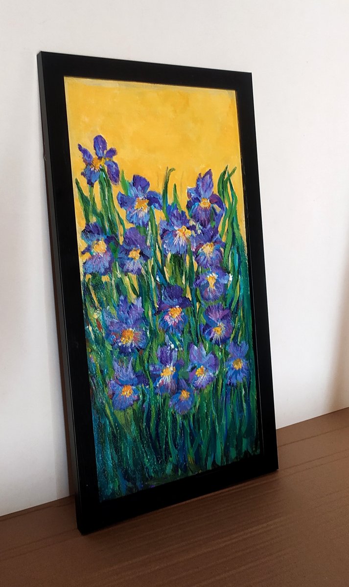 Irises are believed to bring balance and positive energy to a space. The flowing form of the iris is said to harmonize the space. Placing this Iris painting in your space enhances your ability to connect with your inner wisdom and trust your instincts. Irises' its flowing form is believed to harmonize the space, making it a choice addition for those seeking balance and positive energy in your living space.