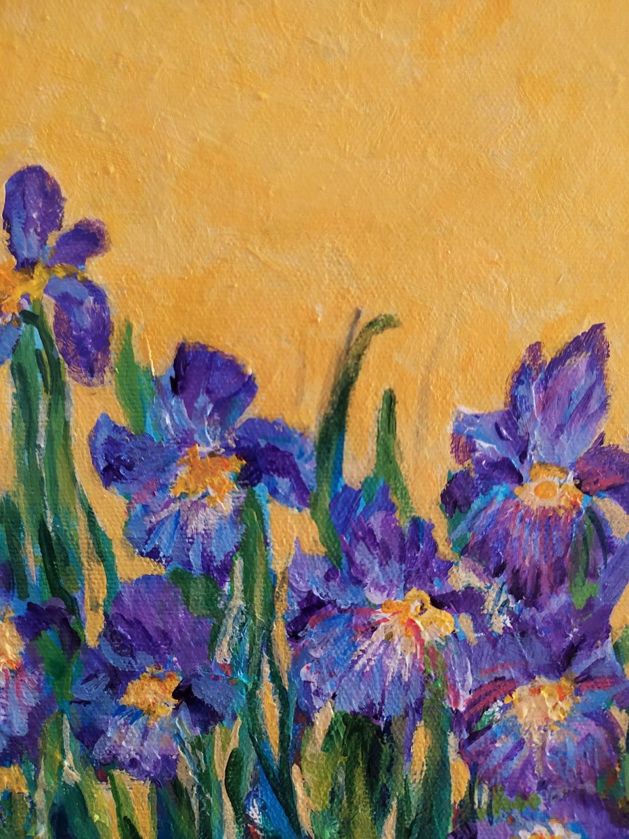 A textured acrylic painting of vibrant irises in a floral garden!