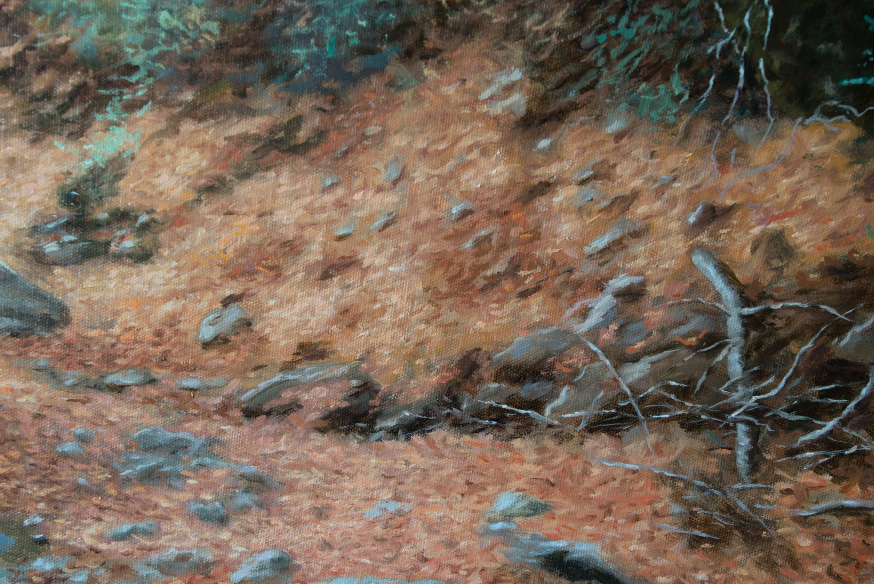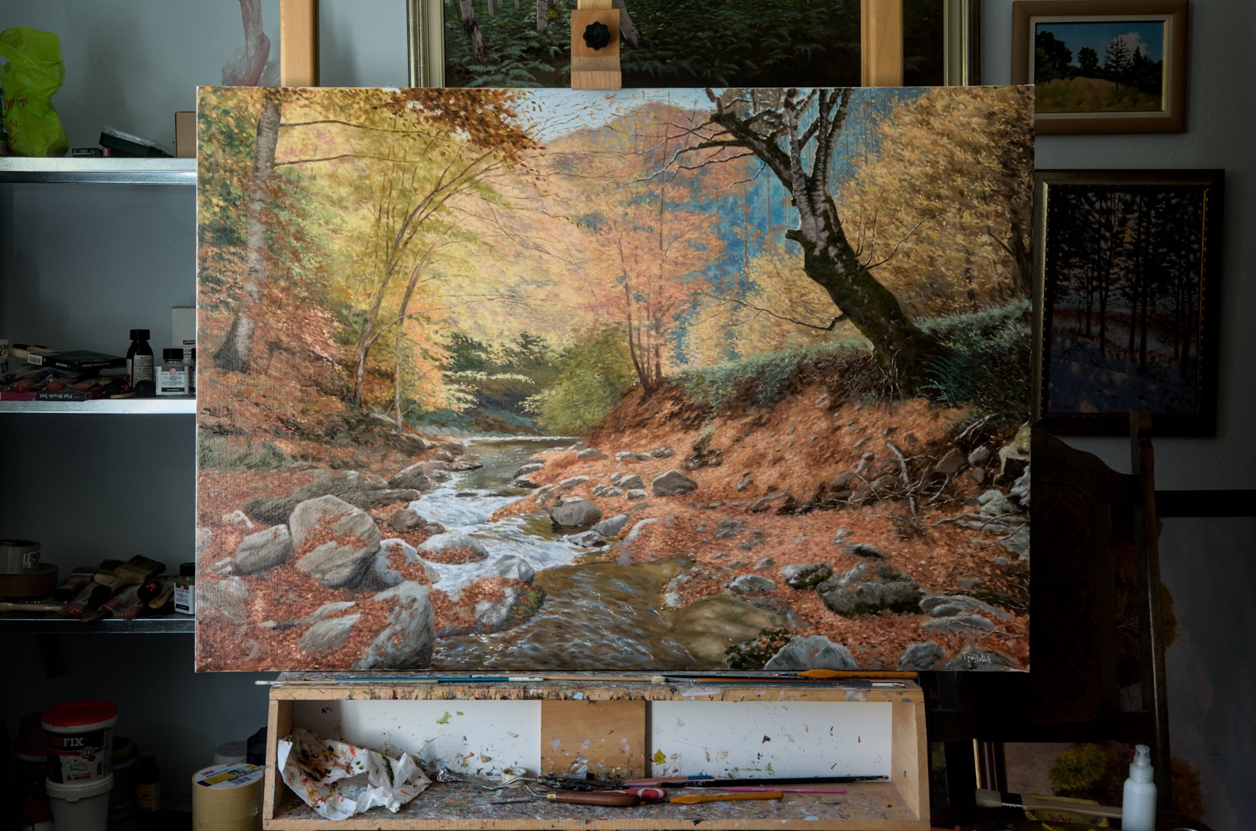 This painting beautifully blends elements of realism and impressionism. The canvas showcases a vibrant landscape featuring a colorful river flowing through a forest. The artist's skillful technique captures the light and reflections on the water, the textures of the trees, and the rich hues of the season.