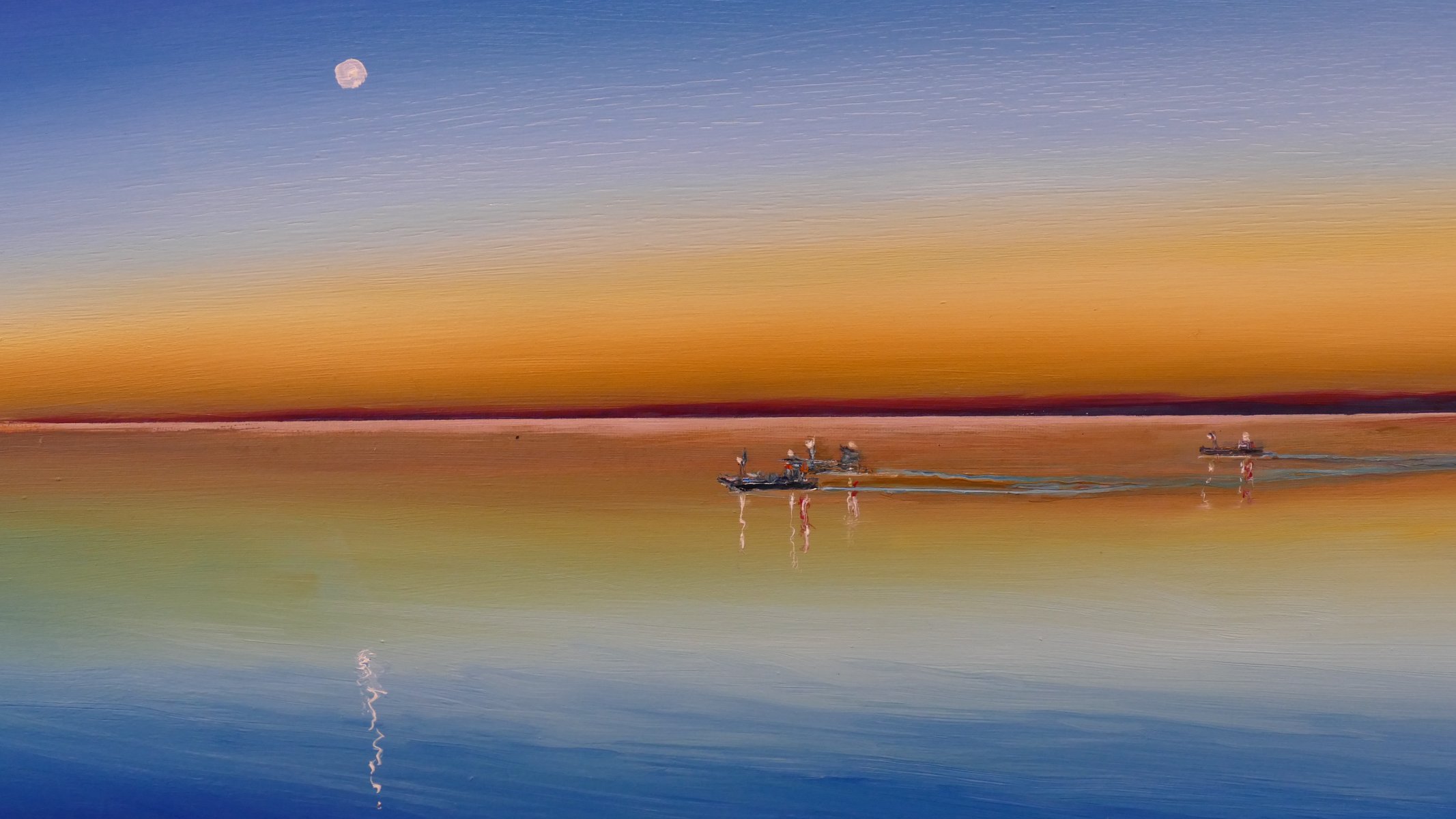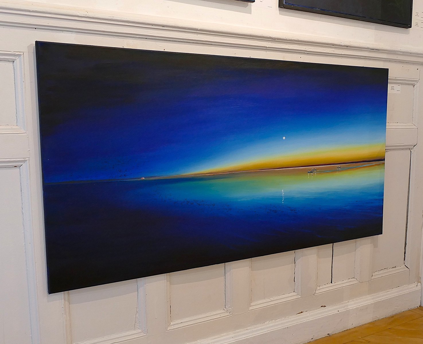 "Mittsommer" by Jörg Althofen is a captivating painting that masterfully captures the serene beauty of a midsummer twilight. The composition is dominated by a vast expanse of deep blues and subtle gradients transitioning into warm golden hues near the horizon, evoking a tranquil and almost meditative atmosphere. The delicate interplay between light and shadow reflects on the calm waters, enhancing the sense of stillness and infinite space. Small boats drifting quietly in the distance add a narrative element, suggesting peaceful human presence within the grandeur of nature. Althofen’s use of color and light in this painting creates an immersive experience that invites contemplation of the fleeting moments between day and night. The work stands as a poetic homage to the natural world’s quiet splendor during the midsummer season.