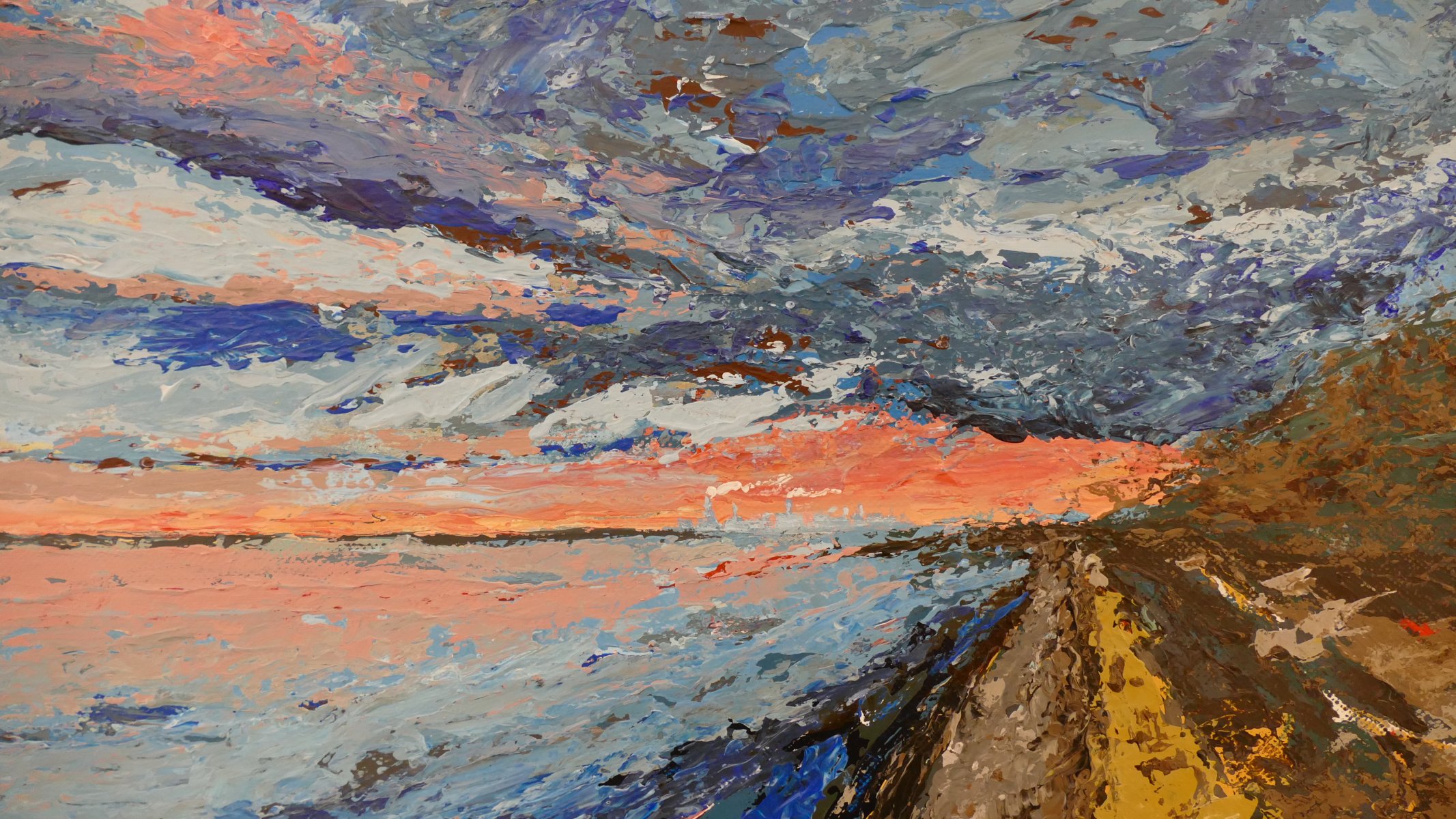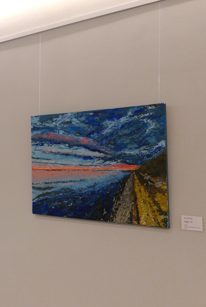 "Egger VII" by Jörg Althofen is a compelling painting that captures the dramatic interplay between land, sea, and sky. The artist employs a rich palette of blues, grays, and warm earth tones to evoke a turbulent yet mesmerizing coastal scene at dusk. The textured brushwork and layered application of paint create a dynamic surface that conveys movement and depth, inviting viewers to explore the shifting atmosphere. The horizon, marked by a vivid streak of coral light, contrasts strikingly with the darker, brooding clouds above, emphasizing the fleeting beauty of twilight. This painting exemplifies Althofen's ability to blend abstraction with natural elements, resulting in a powerful visual narrative that resonates with emotional intensity and a profound sense of place.