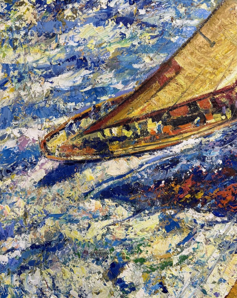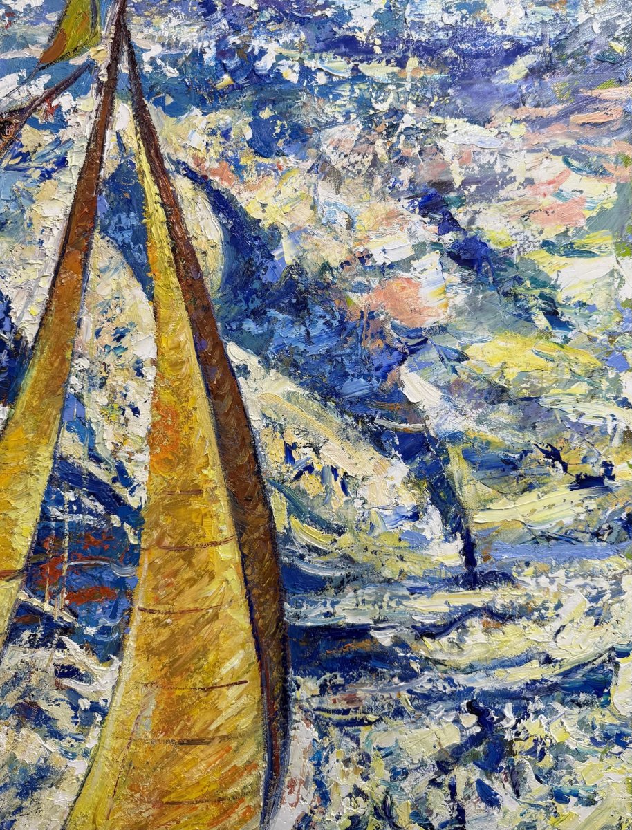 This painting from the “Sails of freedom” series, created in Monaco in 2025, captures the power of motion and the vitality of the sea. Two yachts cut through the waves, leaving shimmering reflections behind them. Energetic strokes and a vivid palette convey wind, rhythm, and the essence of freedom. The immerses the viewer in the dynamic spirit of the ocean and the emotion of a journey.