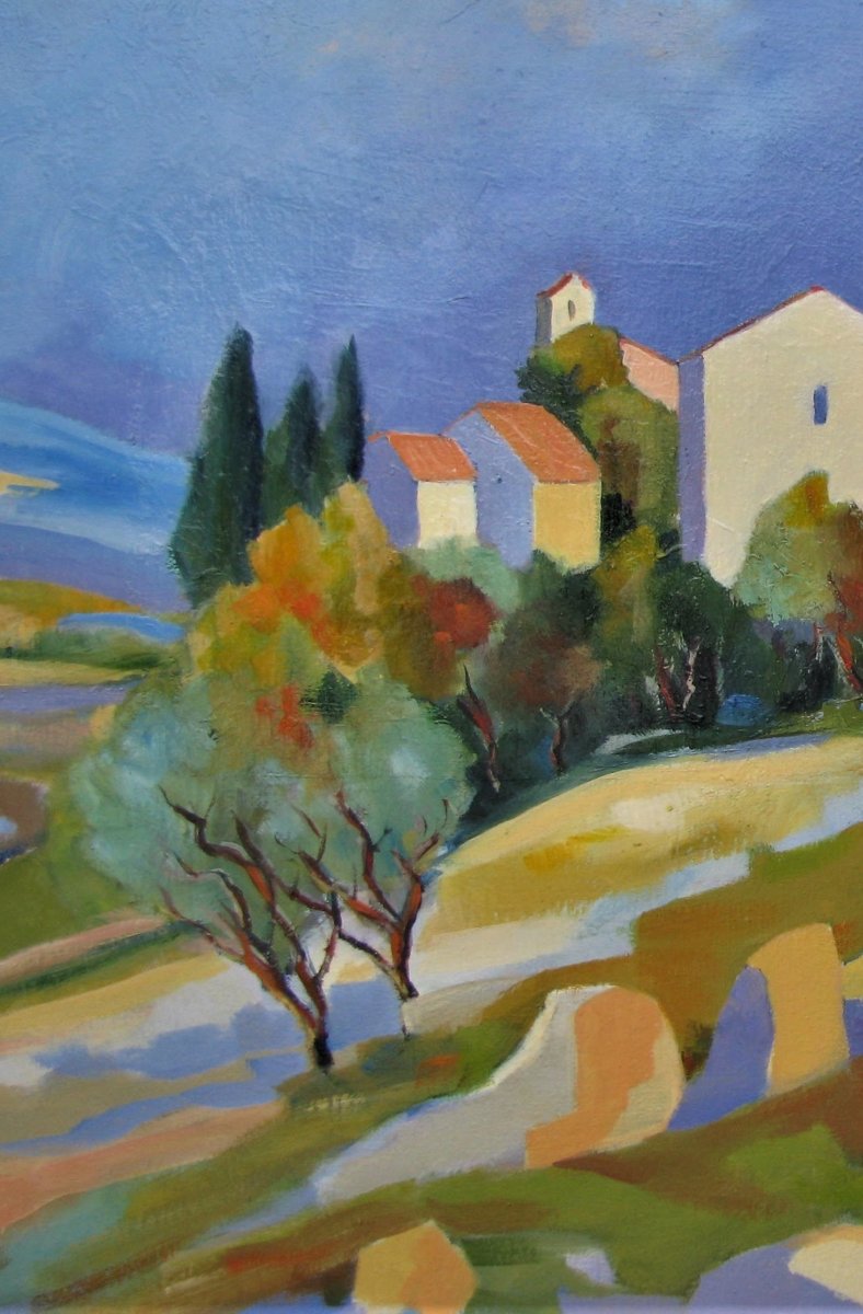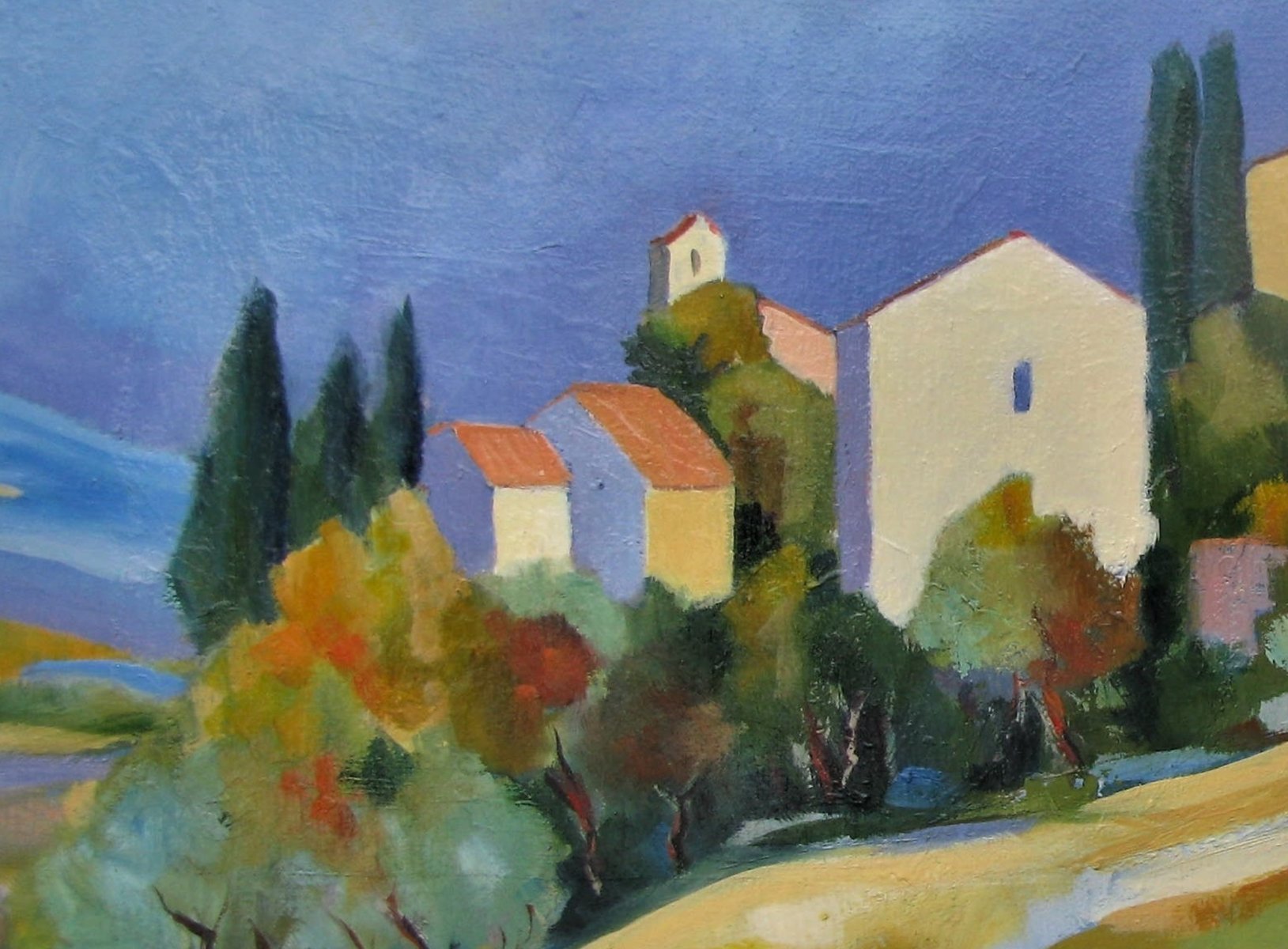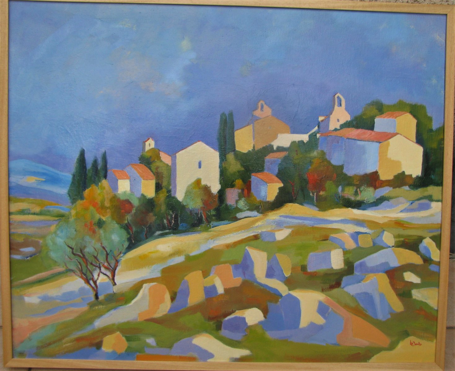 This oil painting depicts the pretty village of Eygalières, located at the foot of the Alpilles mountains in the Bouches-du-Rhône department. It was created using glazing techniques over a period of several months, based on sketches and watercolors made on site. I eliminated everything that didn't seem interesting to me (cars, new houses, poles, etc.) to keep only the essentials. It is framed by a discreet 1 cm wide varnished wooden strip.