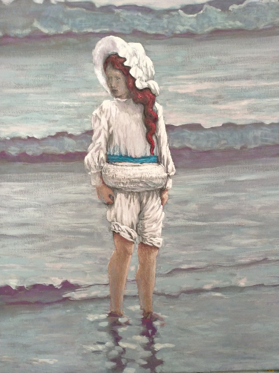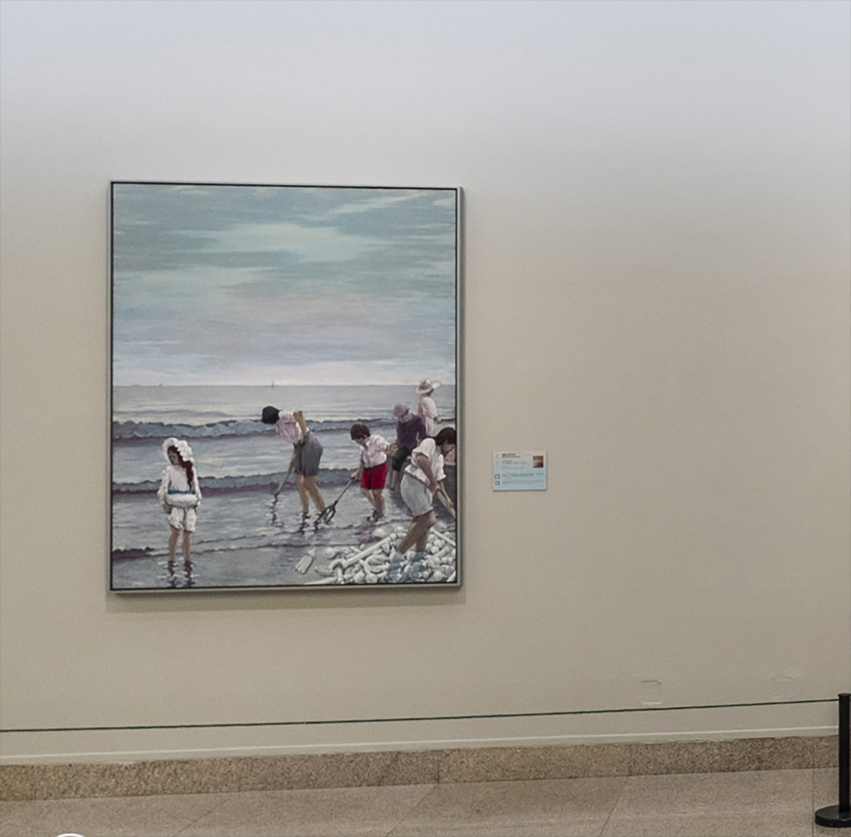 The painting depicts a group of people intent on cleaning the seashore of old light bulbs and broken neon thrown into the sea. The scene takes place at the dawn of a new day with a little girl waiting for the moment to bathe in a sea that has finally been cleaned up.