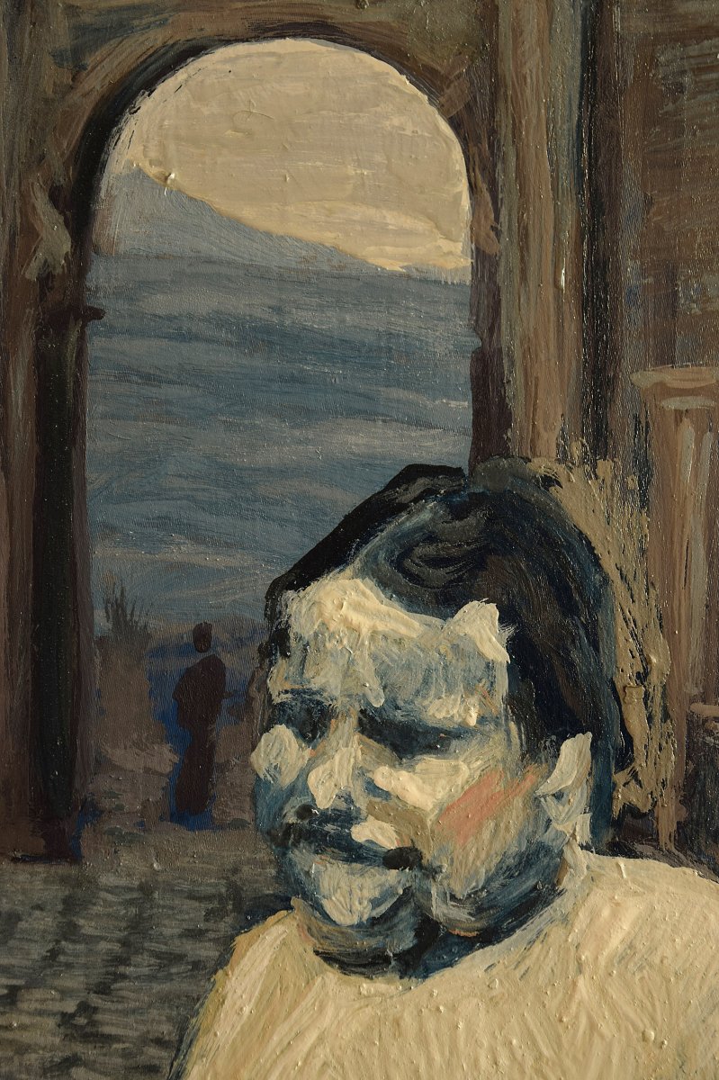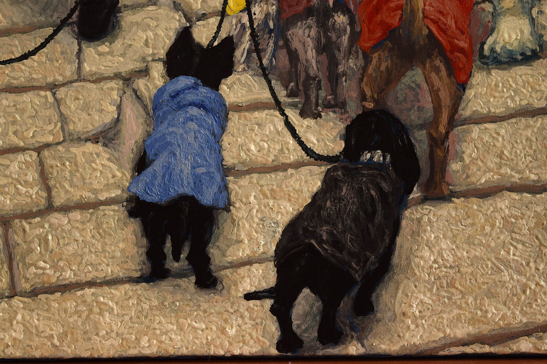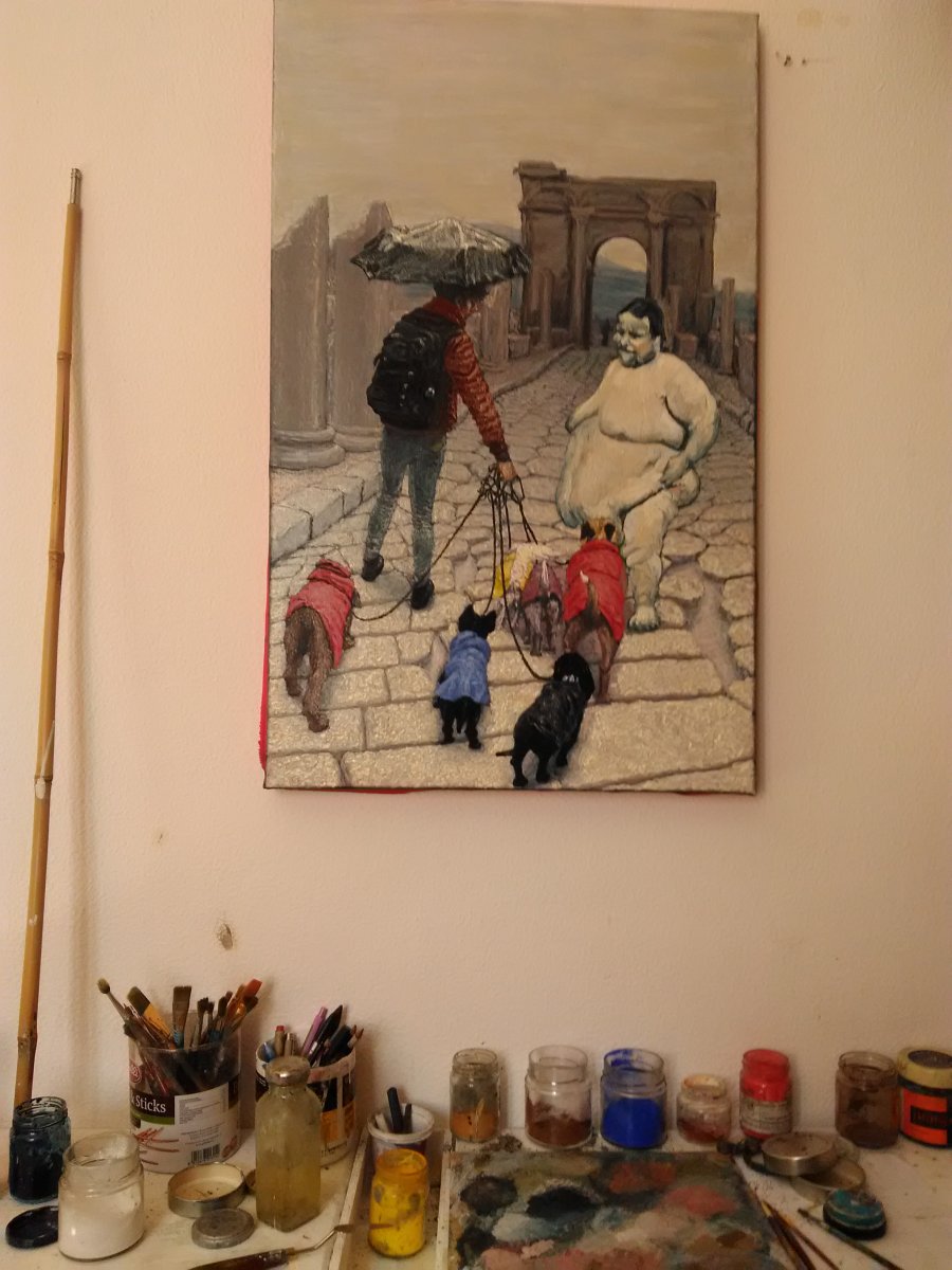The painting depicts a young dog sitter who leads his group of dogs to stroll through the streets of an ancient Roman city in Algeria. As he walks he meets a naked obese woman.