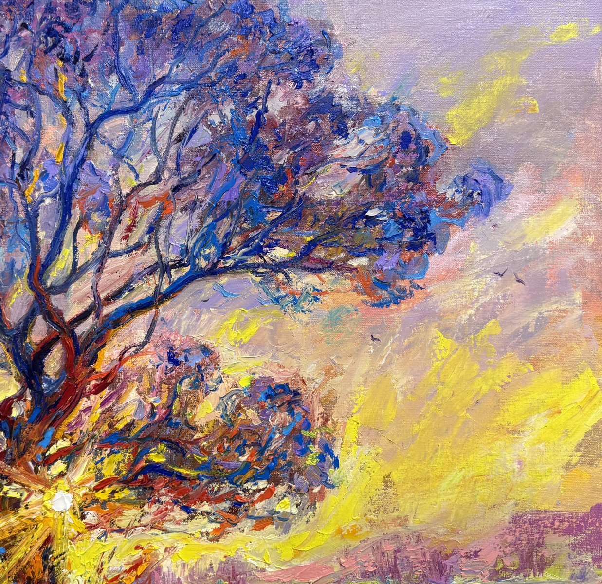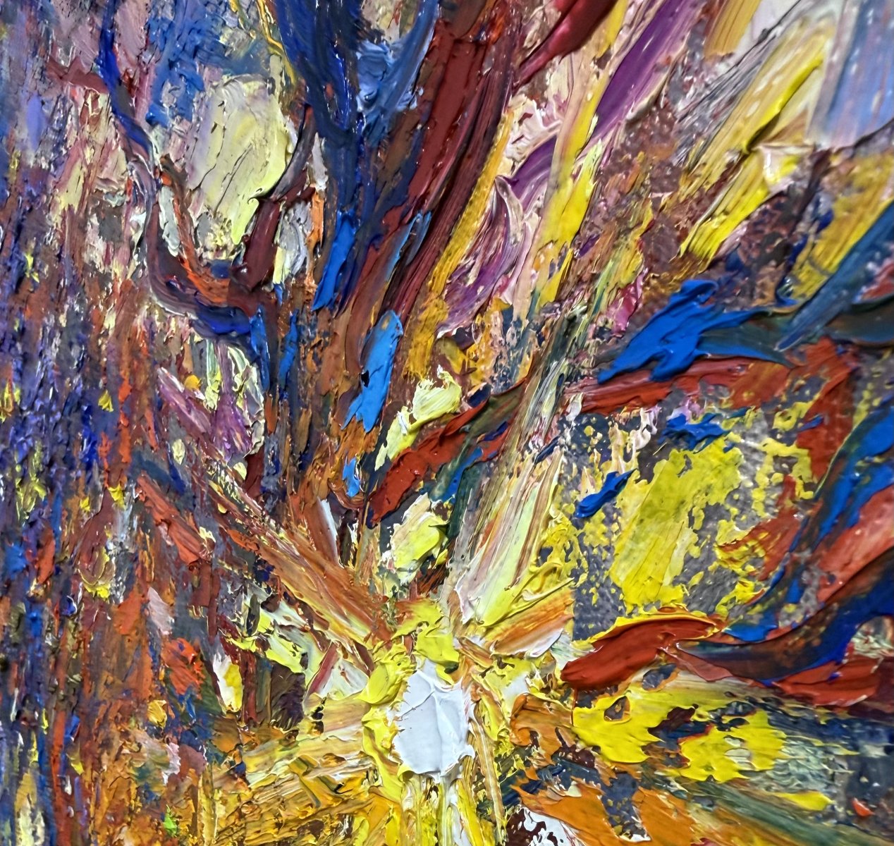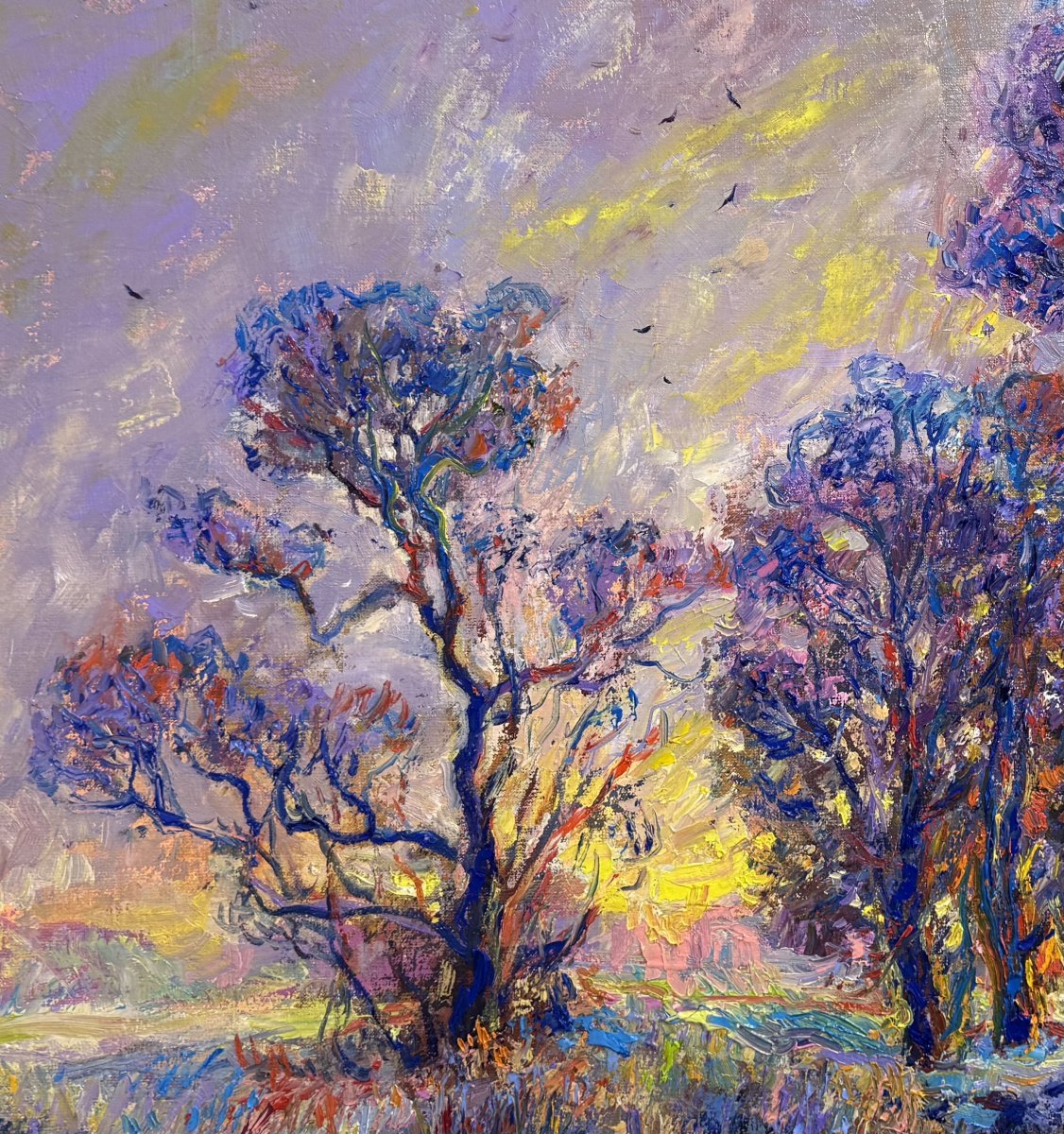 “Moment of happiness” is an expressive landscape painted in 2025 in the village of Sytnyaky, Kyiv region. Radiant sunlight breaks through winter trees, reflecting in water and proving a sense of calm and warmth. Dynamic brushwork and vibrant color harmonies convey light, movement, and a fleeting feeling of pure joy.