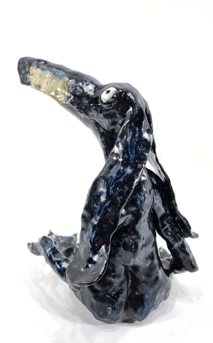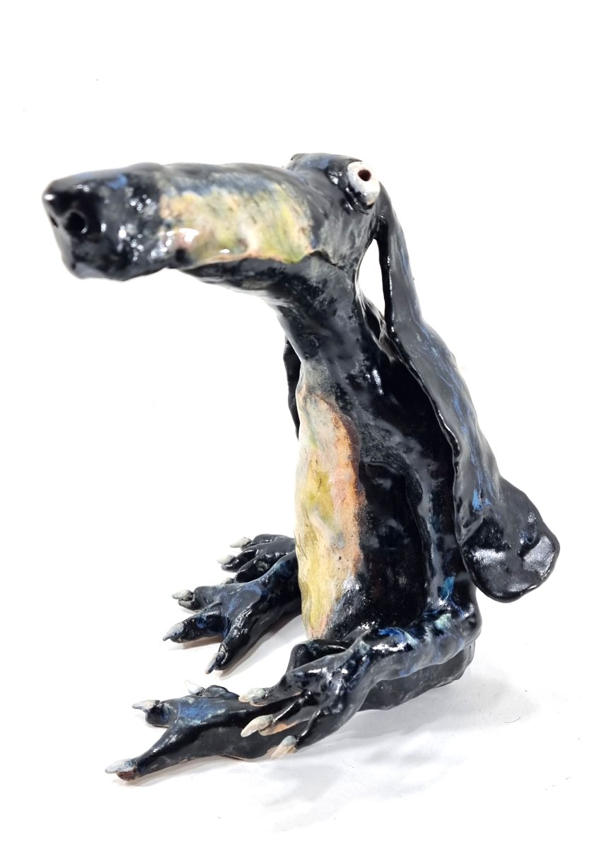 Oswald is a ceramic figure situated between animality and introspection. Its low, grounded stance suggests weight and stability, while the elongated head and focused eye convey alertness and attentiveness. The figure appears paused in a moment of awareness—neither advancing nor retreating.