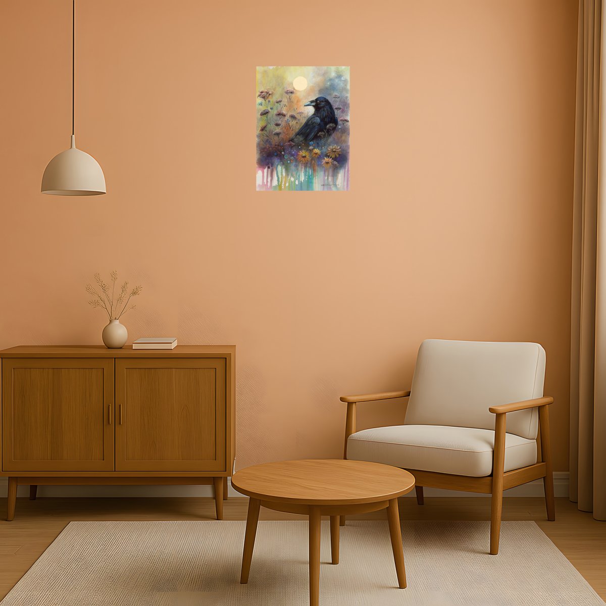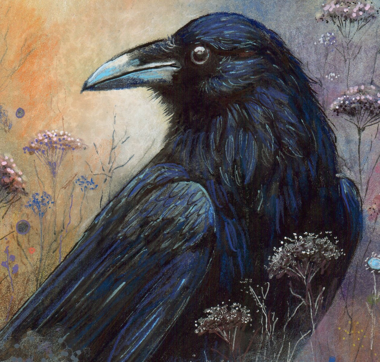 This original artwork by internationally awarded artist Danguole Serstinskaja captures the mysterious presence of a raven surrounded by wildflowers under the glowing sun. The composition blends realism with fantasy, creating a symbolic scene where darkness meets light, silence meets bloom. Rich details and vibrant colors invite the viewer to explore hidden meanings and emotional depth.