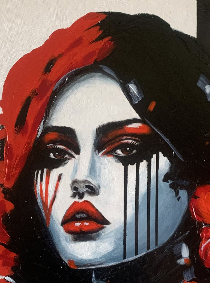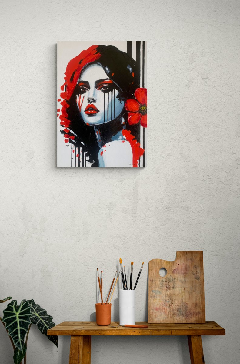 Mysterious Lady captivates with her silent intensity and enigmatic gaze. Bold contrasts of red, black and white draw the viewer into a world of duality — vulnerability and strength, stillness and passion. The expressive brushstrokes and dramatic composition reflect a theatrical quality, inviting contemplation on identity, emotion, and the masks we wear.