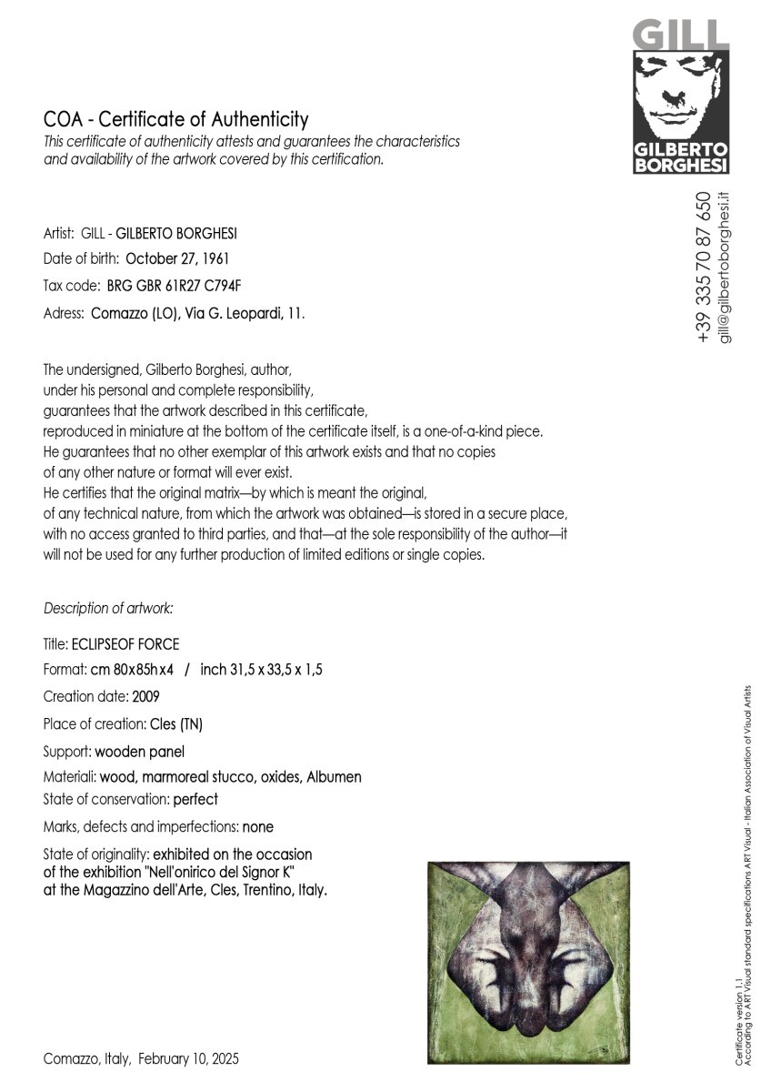 Eclipse of Forces is a seminal work that explores the boundary between abstraction and recognition through a powerful, symmetrical composition. The piece acts as a visual totem, where the central axis balances the raw energy of the materials. It is a direct exploration of the dualism between order and chaos, captured in a moment of alchemical stillness.