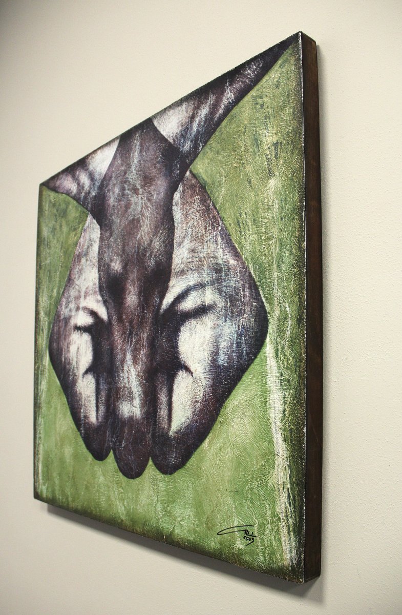 The Alchemical Process: Created on a solid wooden panel, the image is transformed through a textural layering of pure earth pigments and metallic oxides. Using egg albumin as a natural binder and direct sunlight to fix the colors, the process creates a unique, mineral, and timeless surface.