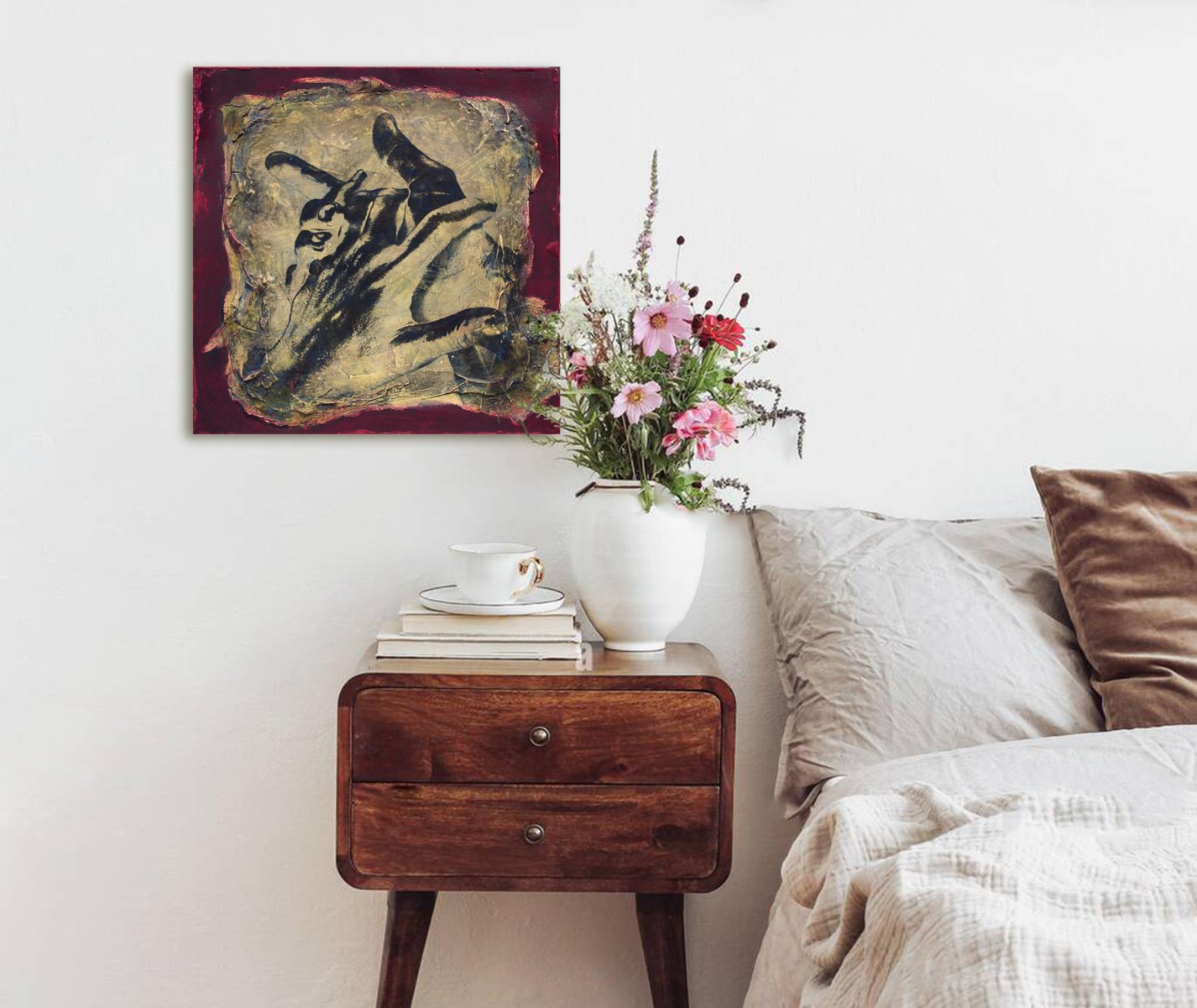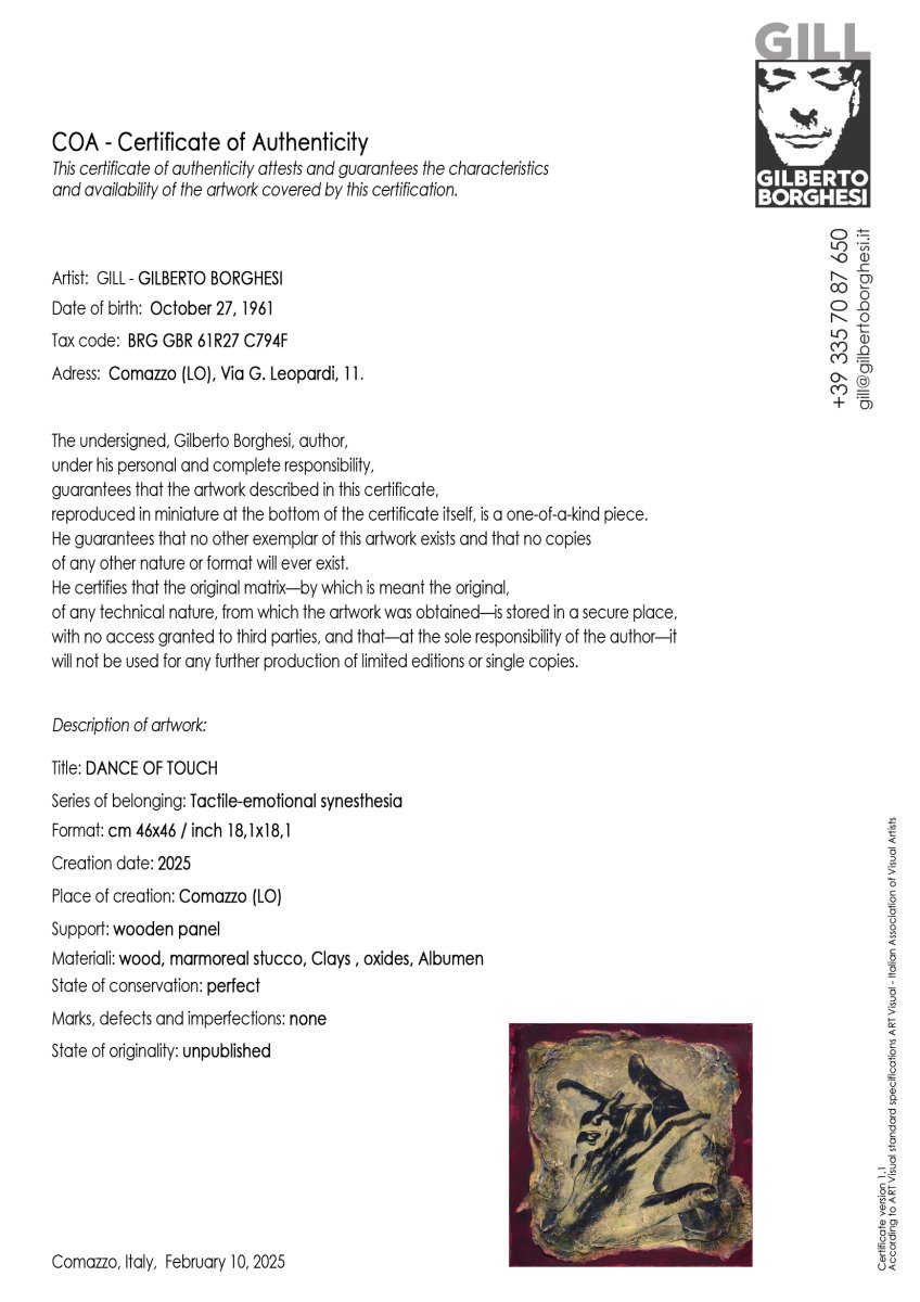 "Dance of Touch" is not merely a painting; it is an exercise in the archaeology of the soul. Through a personal alchemical process that merges photographic memory with physical experimentation, the image is imprinted onto a wooden panel and transformed through a textural layering of pure earth pigments and metallic oxides.