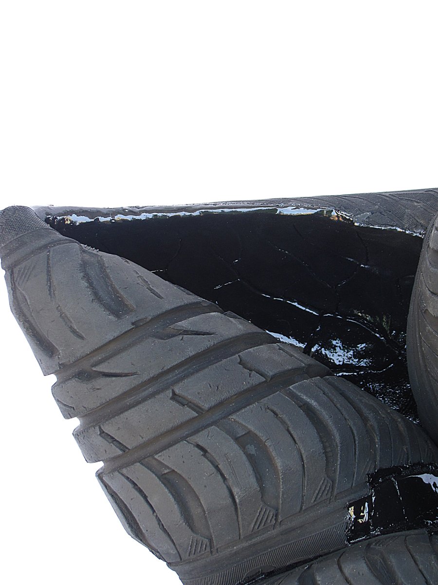 The work is part of the "Timemachine" installation, consisting of 12 sculptures all made with old tires trussed on the street, worked, modified and sculpted. The velvety and opaque black color of the tires contrasts with the shiny and metallic black of the resins. The work analyzes the circularity of time as opposed to the circularity of the wheel of the car that turns endlessly. The work also emphasizes the circularity in the recycling and reuse of materials, which through the passage of time changes their form and function. No longer a car tire, but a sculpture depicting an abstract shape. The installation was exhibited in various exhibitions including at the "Cro Art Gallery" in Vienna in 2016, in collaboration with the Embassy of Italy in Austria, and published in the catalog of the publishing house "Il Mondo di Suk".