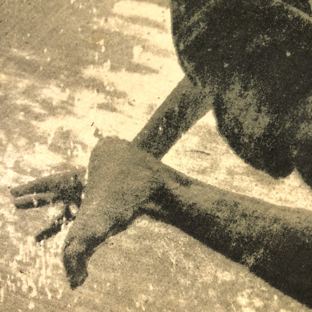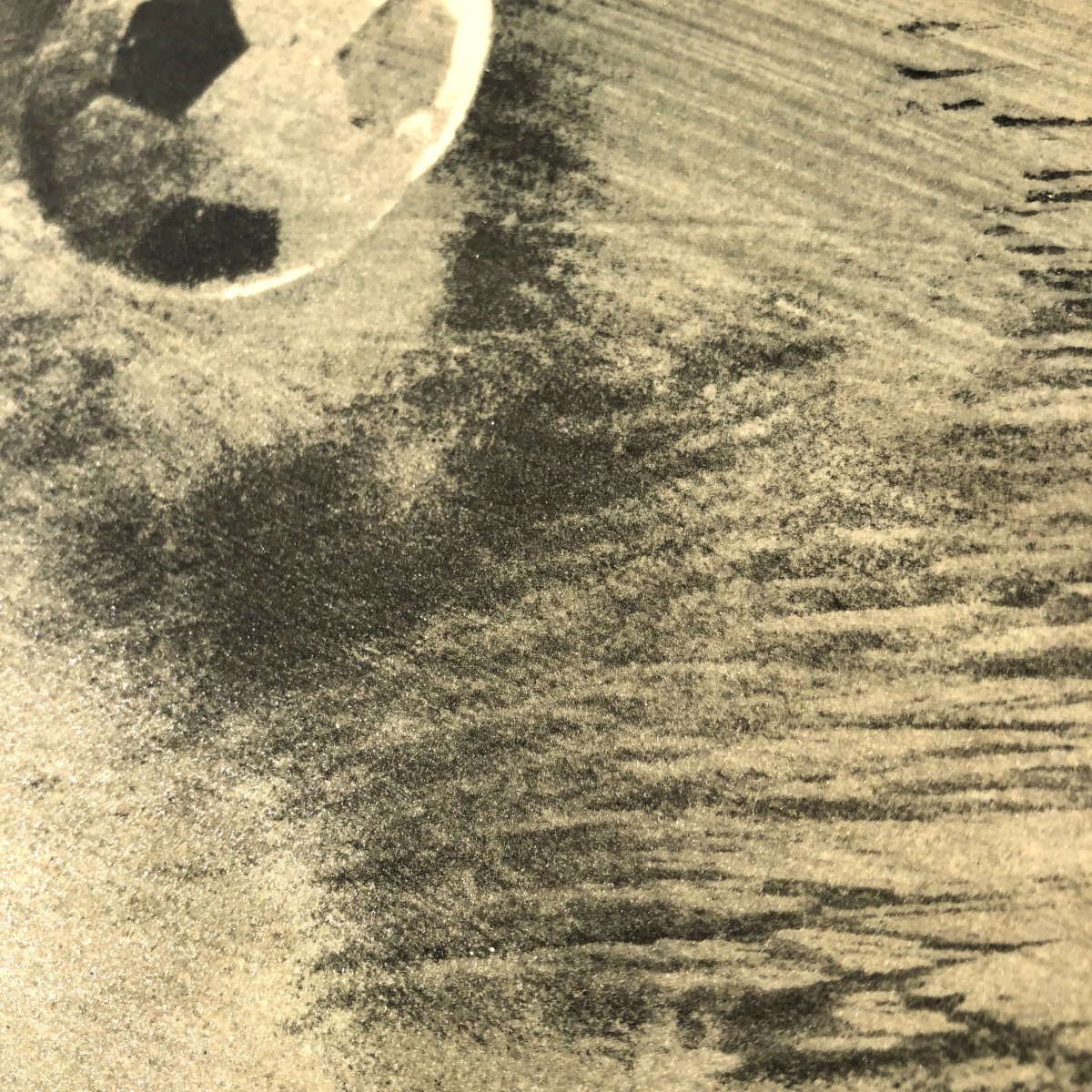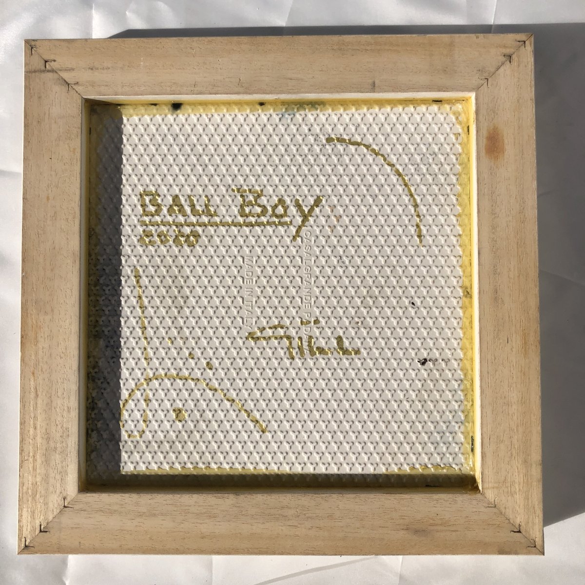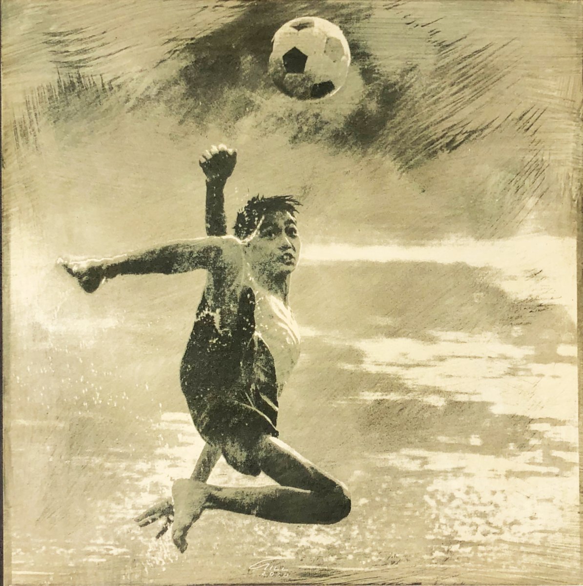 "Ball Boy" is a powerful study of human movement and vertical energy. The figure is captured in mid-air, a plastic and acrobatic silhouette that seems to vibrate against the textured background. The monochrome palette and the distressed, grainy finish give the image a vintage quality, as if it were a rediscovered fragment of history. The permanent weight of the handmade ceramic grounds this fleeting moment of athletic prowess, creating a fascinating contrast between lightness and matter.
