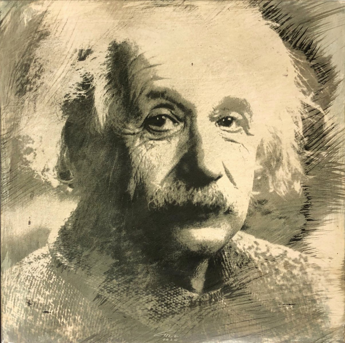 This portrait of Albert Einstein is a technical triumph of ceramic experimentation. Captured on a solid tile, the iconic features of the physicist are rendered through the traditional use of engobes and ceramic enamels. These materials, applied with a contemporary vision, create a surface that is both tactile and reflective, mirroring the multi-layered nature of Einstein's theories. The "distressed" finish gives the face a timeless quality, as if the image were etched into the fabric of time itself.