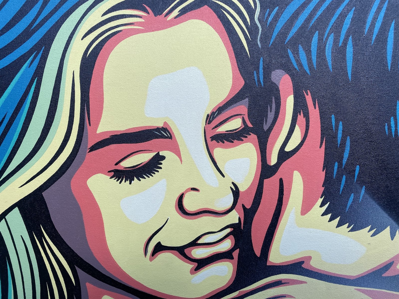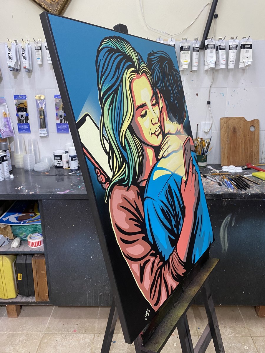 In this expressive acrylic painting, I blend vivid comics and pop art styles to capture a poignant, modern love scene. Here, a couple embraces, yet both their attention is drawn away by their smartphones, a symbol of our digital age's distractions. This artwork aims to provoke reflection on personal connections in today's technology-saturated environment, adding a dynamic, thought-provoking energy to any space.