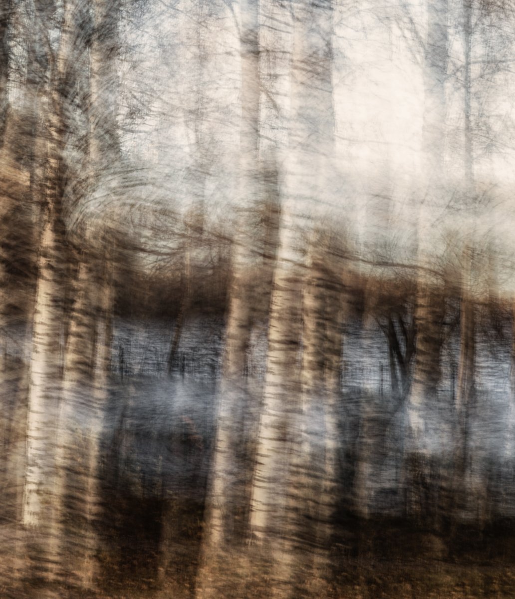 "Birches on the Lakeshore” is an evocative fine art photograph that blurs the lines between reality and abstraction, creating a dreamlike impression of slender birch trees reflected in the stillness of a lakeside setting. The intricate layering of textures, combined with soft, earthy tones and muted blues, evokes a sense of quiet contemplation and harmony with nature. The motion-like effect in the composition enhances the feeling of movement, as though the trees are swaying gently in a breeze or resonating with the whispers of the lake.