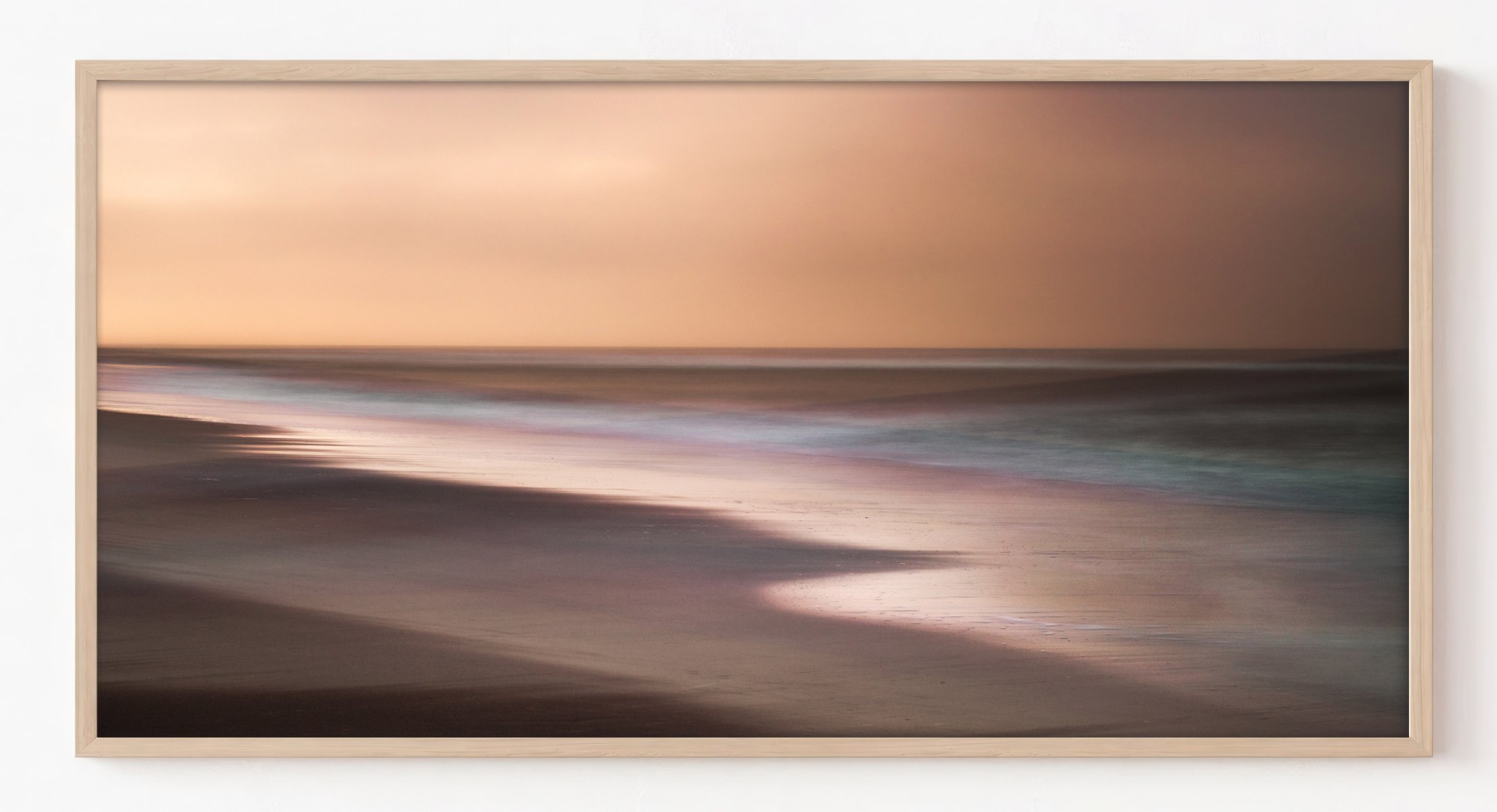 The artwork is defined by a refined and delicate palette, where warm and cool tones blend into a harmonious gradient. The hues of the setting sun unfold in veiled gold, fading into blush pink and amber, while the sea adopts shades of muted blue, lavender, and pearlescent highlights.