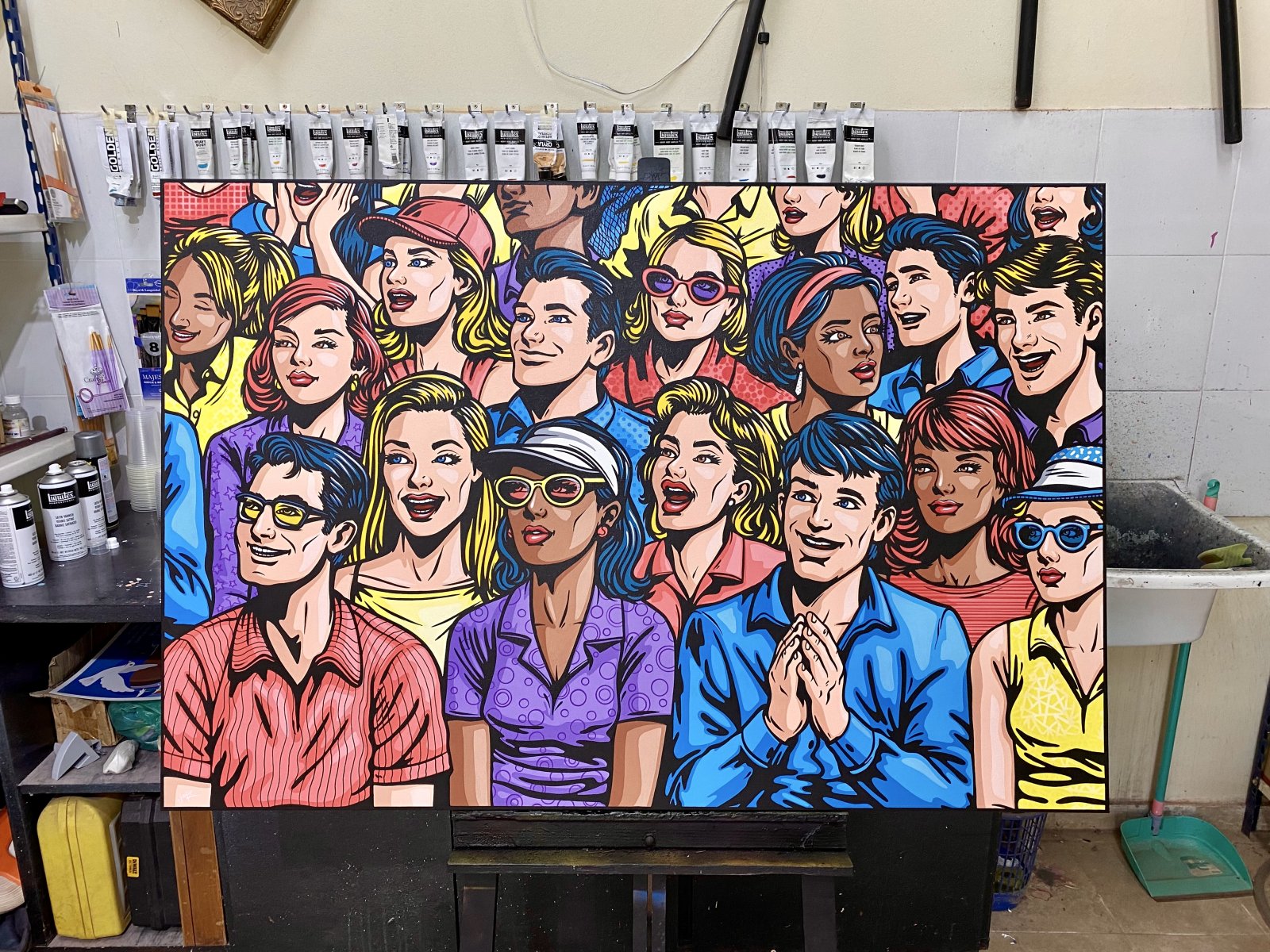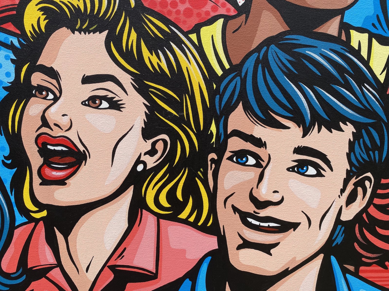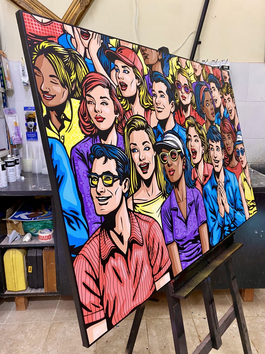 New balls please. Comic book style pop art painting of a crowd of young tennis fans watching a match. It seems like the winner for 15-0 was a fairly impressive one, at least, most of the crowd thought so. In this vibrant acrylic painting, I aimed to capture the exuberance and variety of human expression and interaction, during a sporting event. We don't see the game at all, only them.