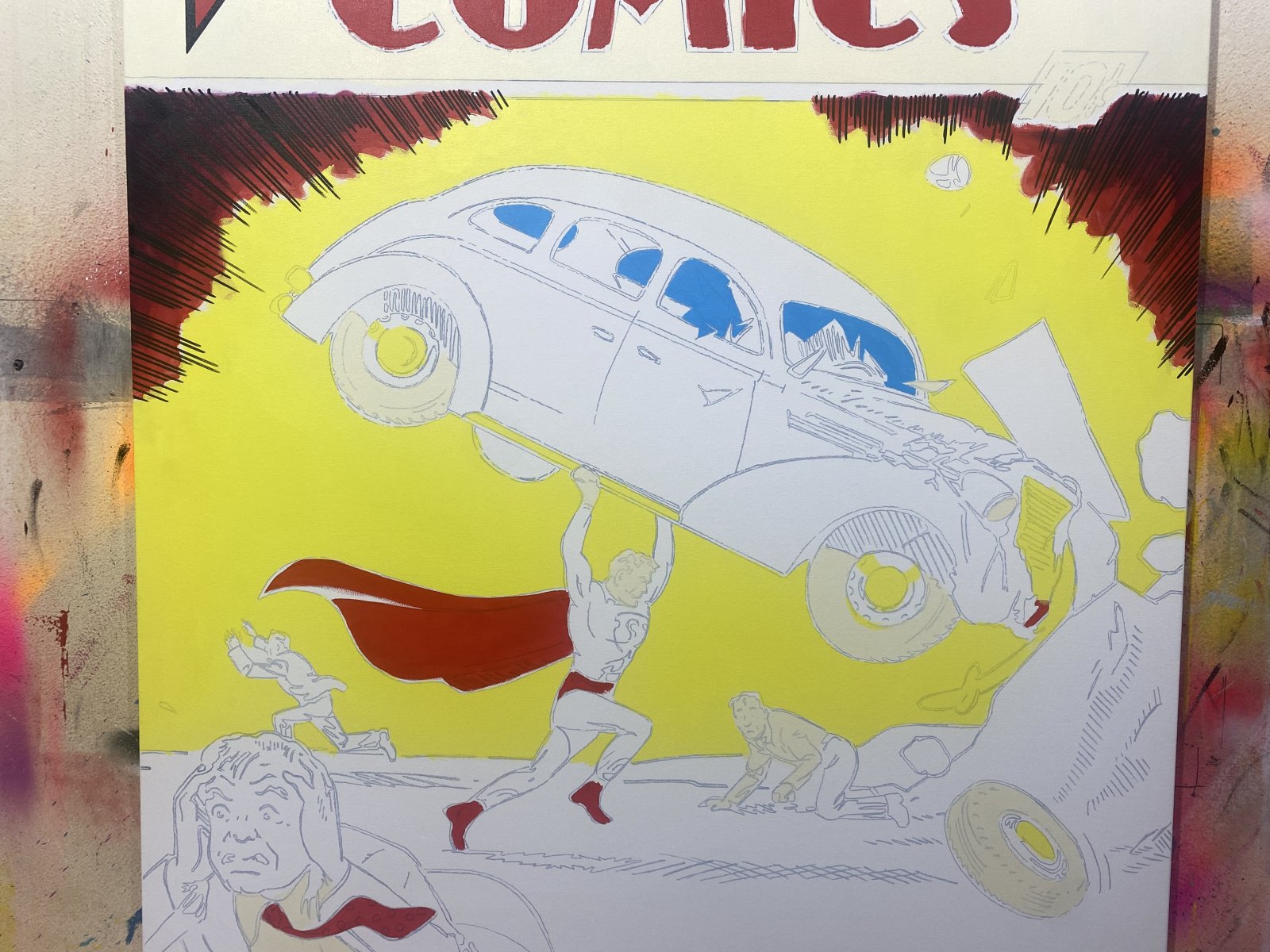 An exact replica hand painted version of the cover of Action Comics #1. This comic introduced the world to Superman for the first time back in 1938. The original illustration was by comic book legend Joe Shuster and copies of the first issue are so rare and so collectible that they sell for millions of dollars. Drawn out and hand painted in professional quality acrylics, the sides are painted black. Due to its size, this painting ships removed from its stretched frame and rolled in a tube. Any reputable picture framer will re-stretch it ready to hang.