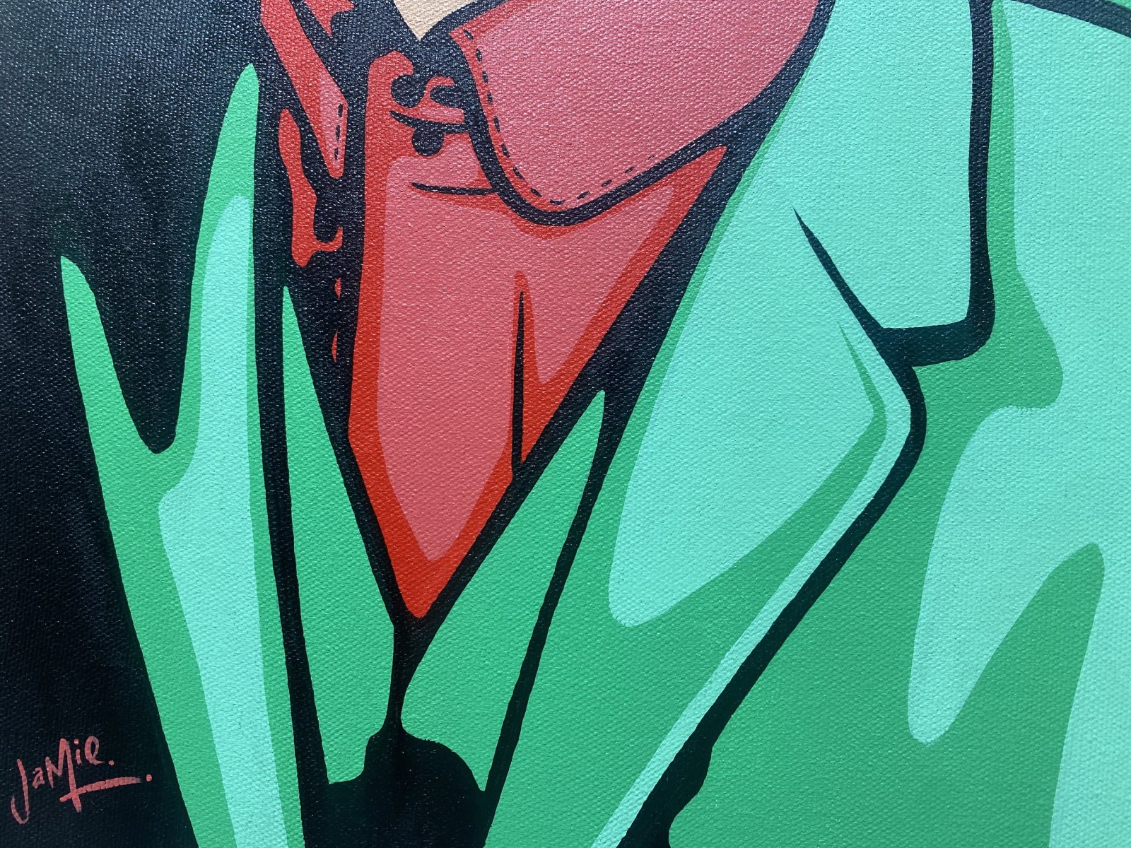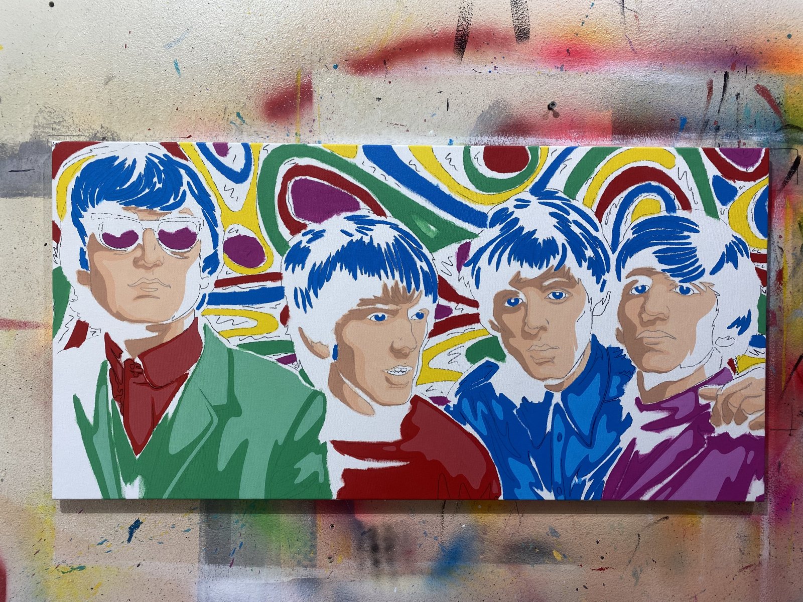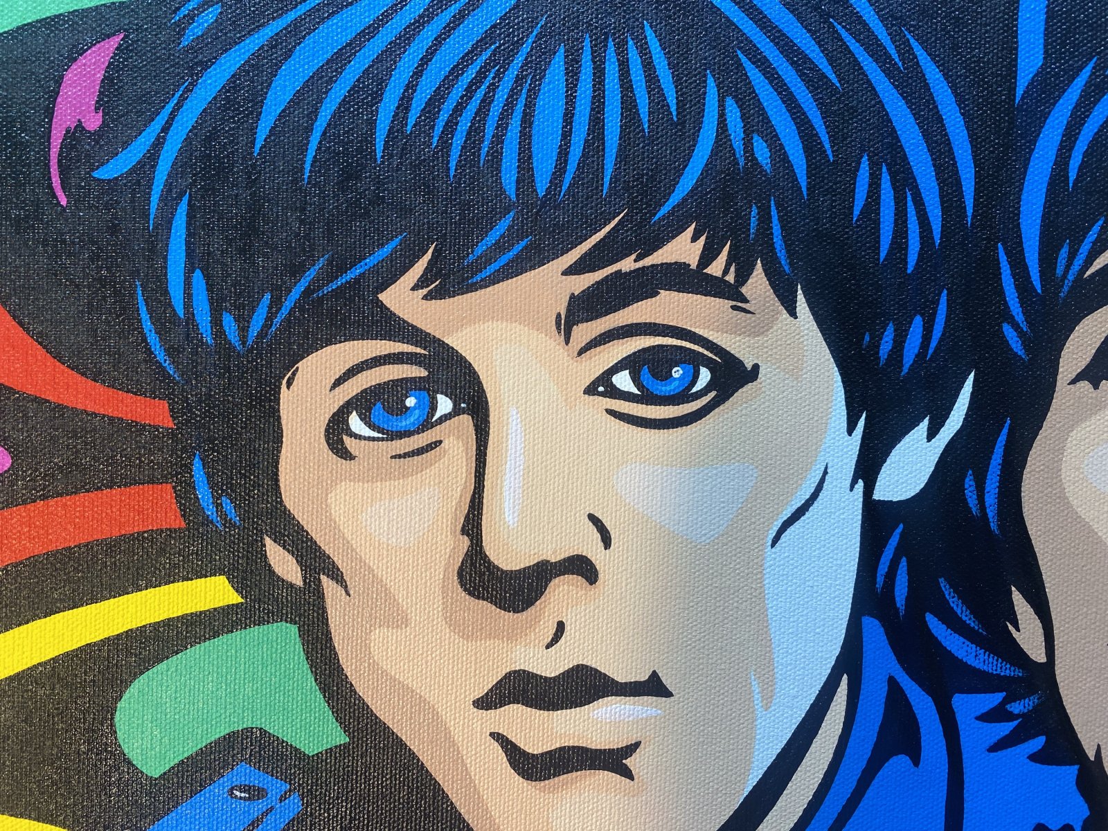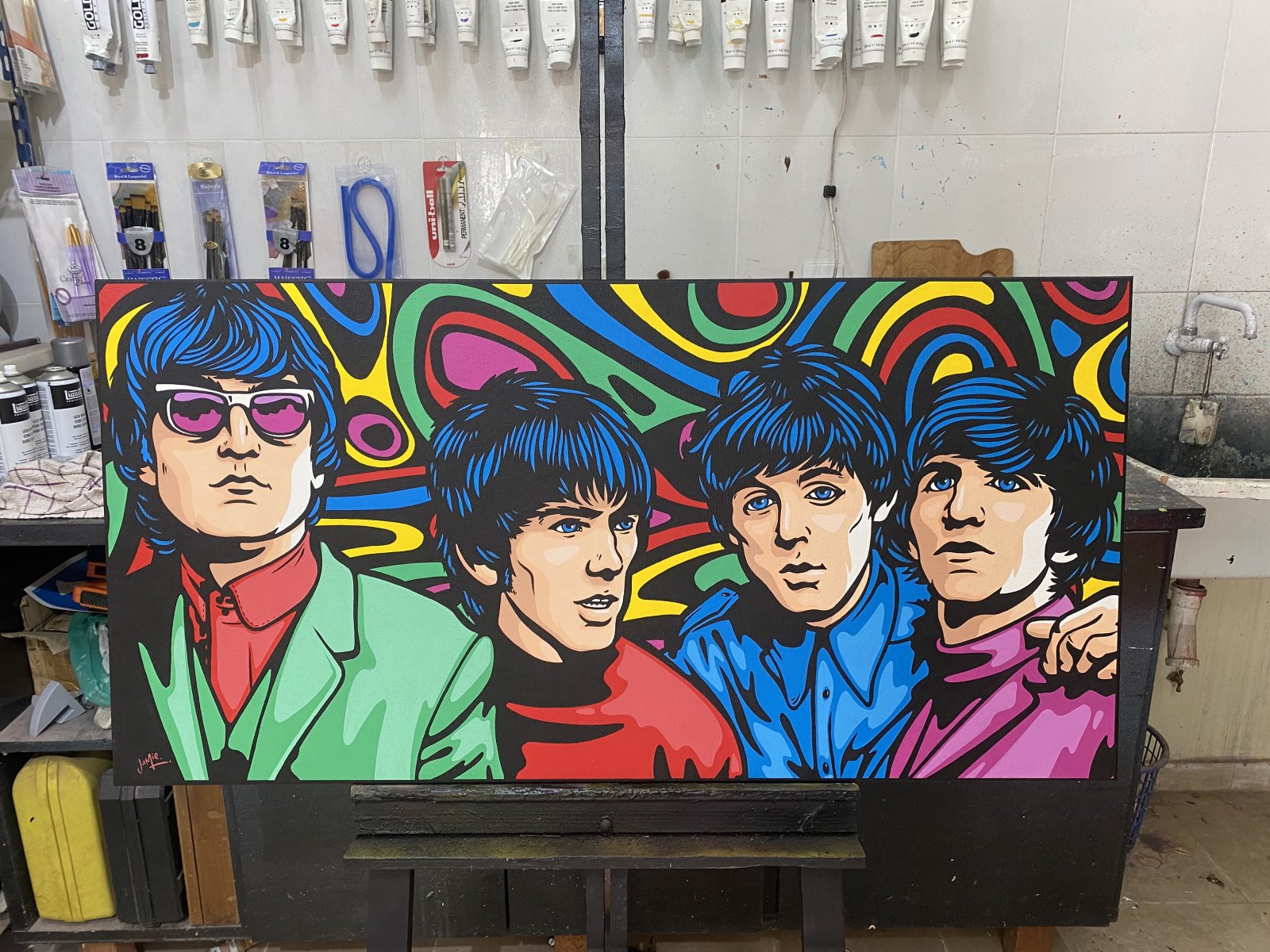 Comic book style pop art painting of British musical legends, The Beatles. Based on an early black and white photo of the Fab Four, I used the colours from their Sergeant Peppers uniforms to bring the two ends of their career into one image. John Lennon, Paul McCartney, George Harrison and Ringo Starr in glorious technicolour.