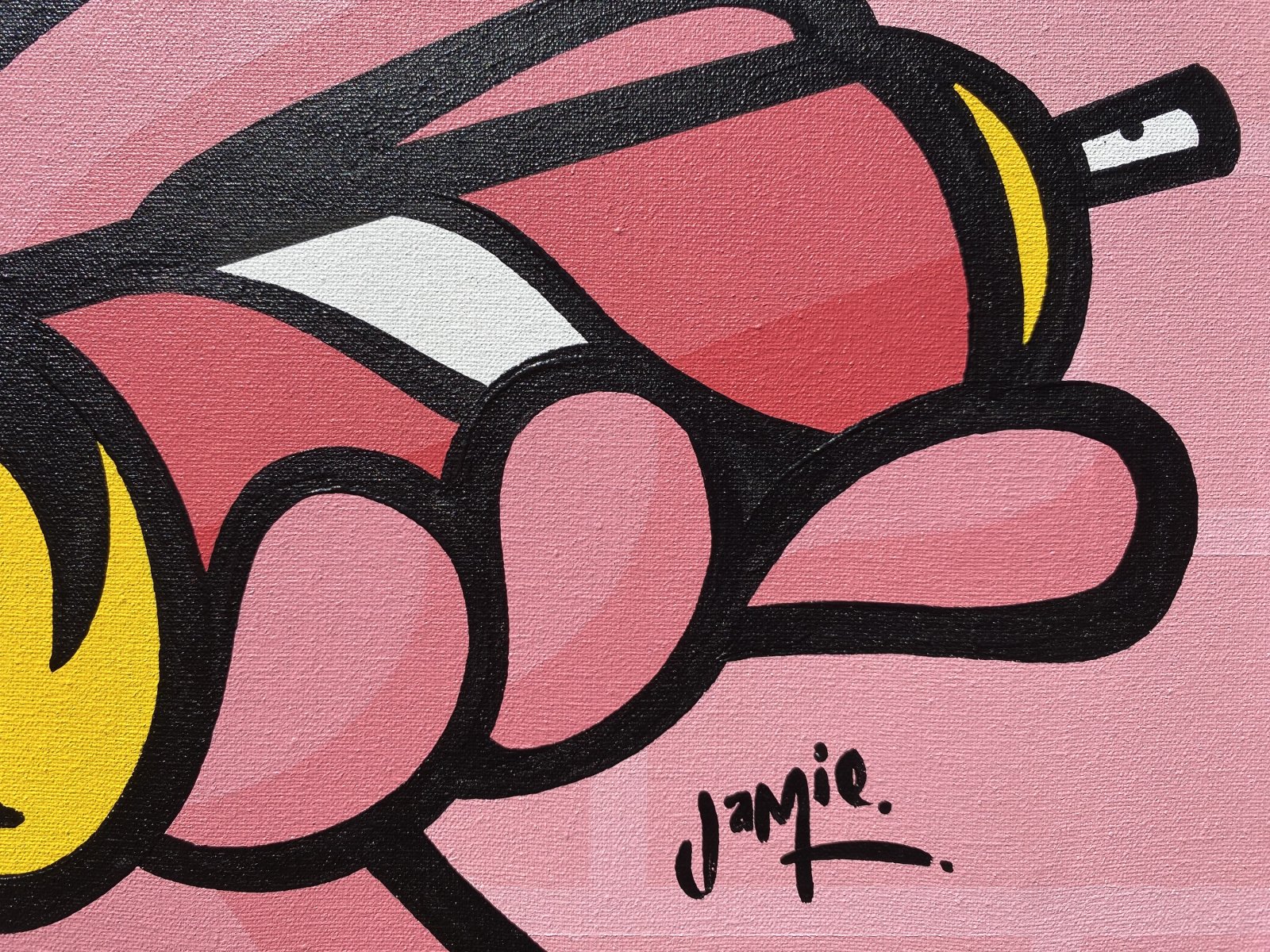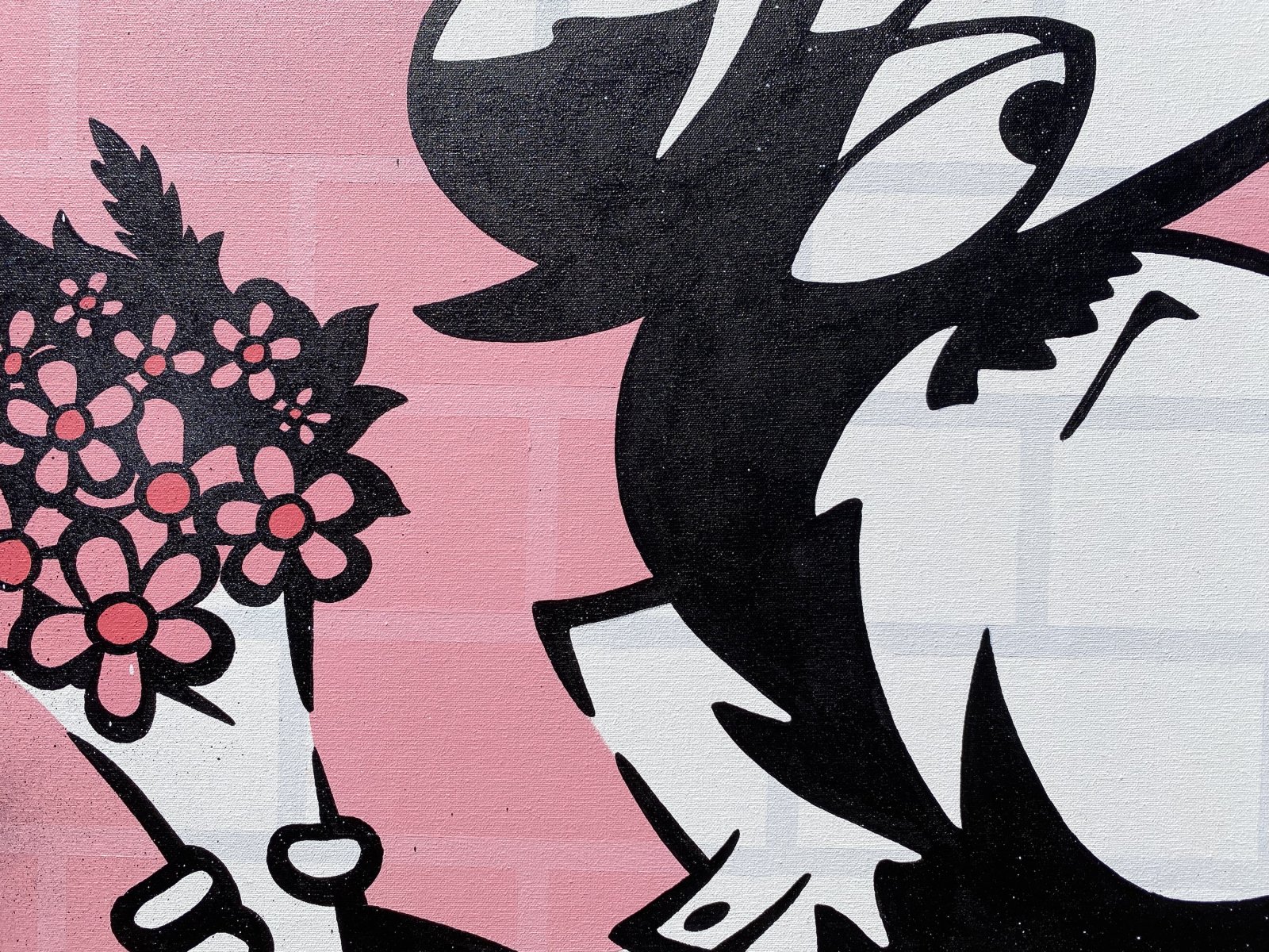 In this vibrant pop piece we see the Pink Panther channelling his inner Banksy. He stands proudly in front of his urban artwork depicting Inspector Clouseau throwing a bunch of flowers in an act of peace. An original comic book painting in professional acrylics.