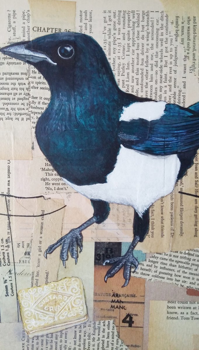 This painting measures 30 cm x 30 cm (x 2.5 cm deep) it is painted onto a collage of found papers on board.