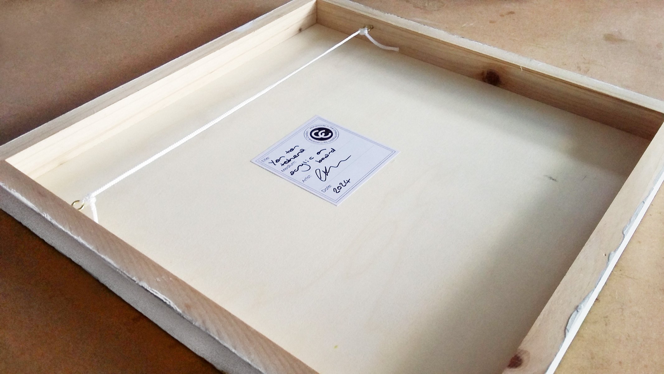 This painting is painted on a cradled wood panel (30 cm x 30 cm (x 2.5 mm deep) and is ready to hang. The sides of the cradled panel are painted white.