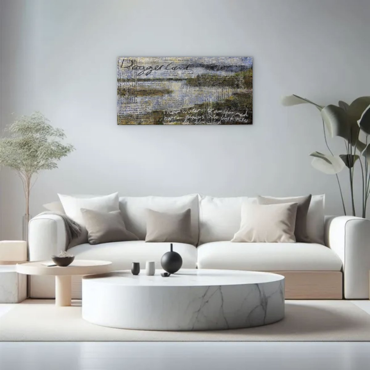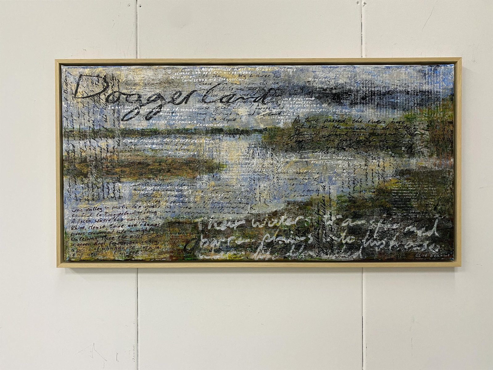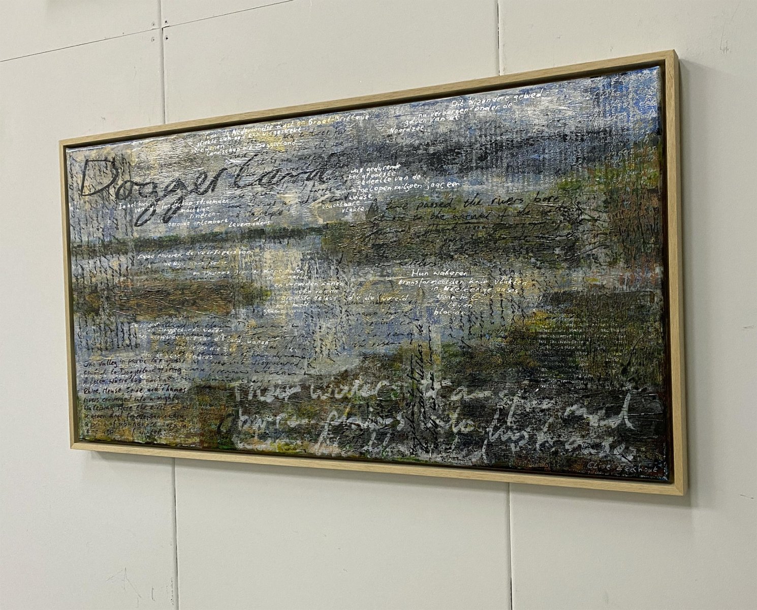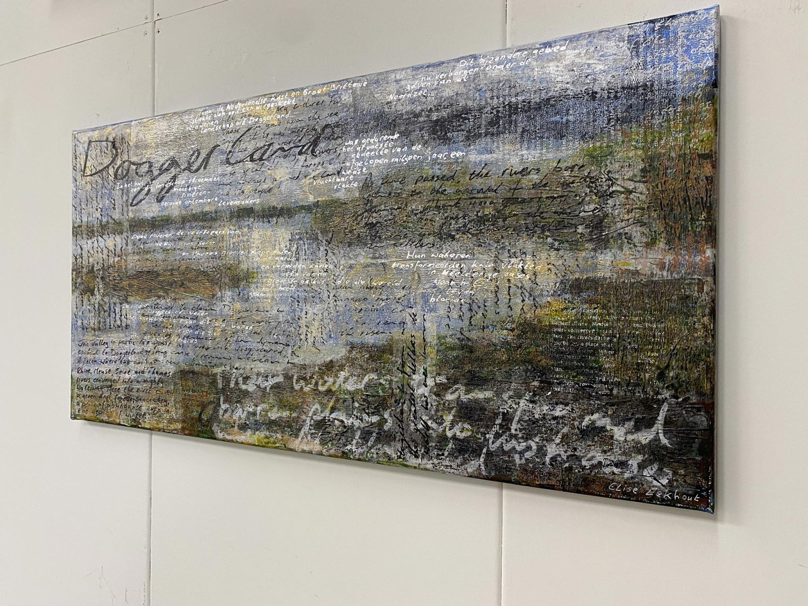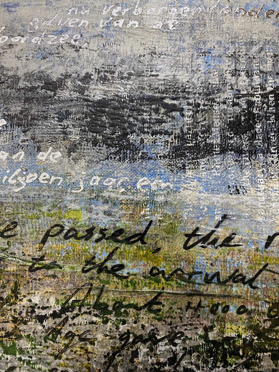 This contemporary artwork is made with acrylics on fine linnen. The handwritten texts and the screen printed lyrics refer to the ancient land that is now on the bottom of the North Sea. Some of the handwritten texts are gilded with silver and gold colored foil. This makes the texts seem to appear and disappear depending on how the light falls on them.