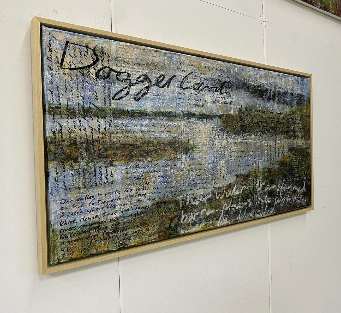 This painting reflects on Doggerland, the vast land that once connected Britain to continental Europe before it disappeared beneath the rising seas. This drowned landscape speaks not only of ancient history but also of our present time. Rising sea levels and climate change once again threaten coastlines, echoing the fate of this forgotten land. The work is layered with text in silver foil, ink, acrylic markers, and screen print. Words shimmer and fade depending on the light, just as memory and history shift between presence and absence. The reflective surfaces act like water: sometimes concealing, sometimes revealing. For me, Doggerland embodies both resilience and fragility. It was once a fertile corridor of life, later drowned by the unstoppable sea. In my work, I revisit this lost world not as a reconstruction, but as a mirror. What is drowned may return as a warning.