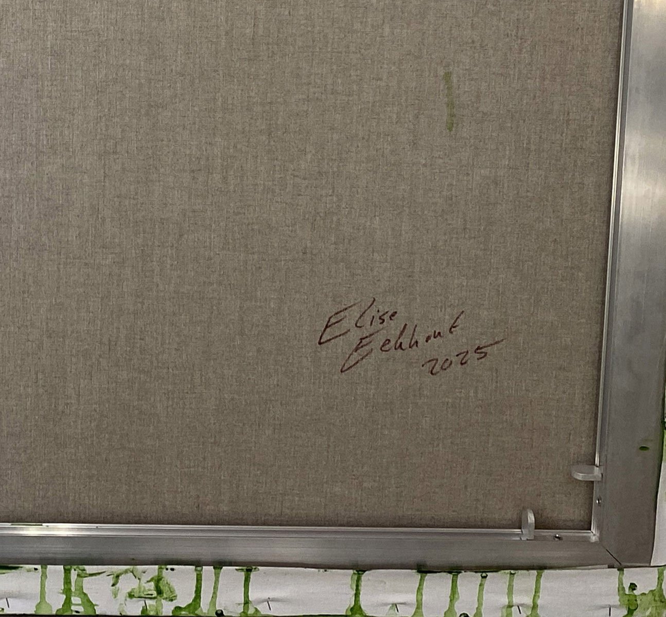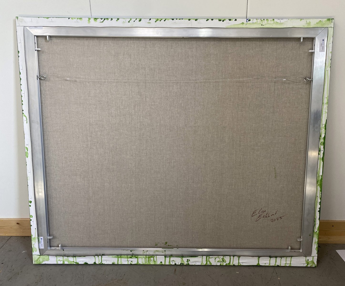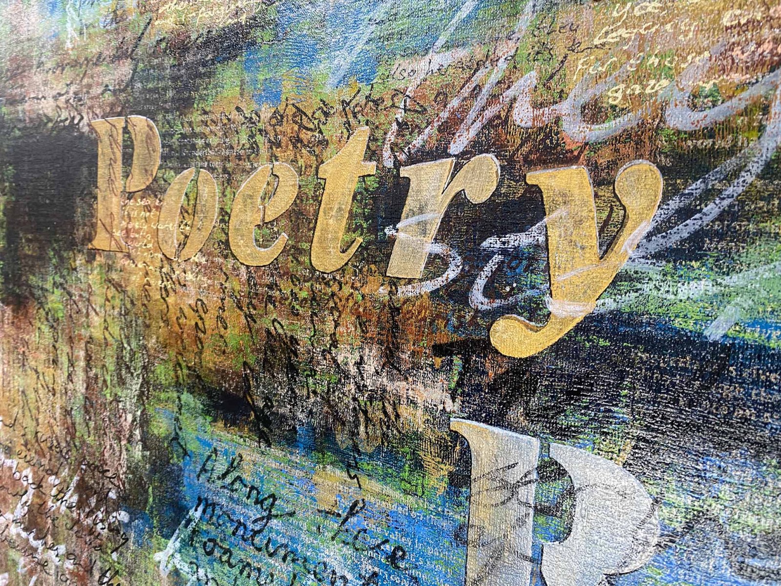 This contemporary artwork is made with acrylics on fine linnen. Stretched on an aluminium stretcher. The sides are painted, so there is no need for a frame. Some of the handwritten texts are gilded with silver and gold colored foil. This makes the texts seem to appear and disappear depending on how the light falls on them.