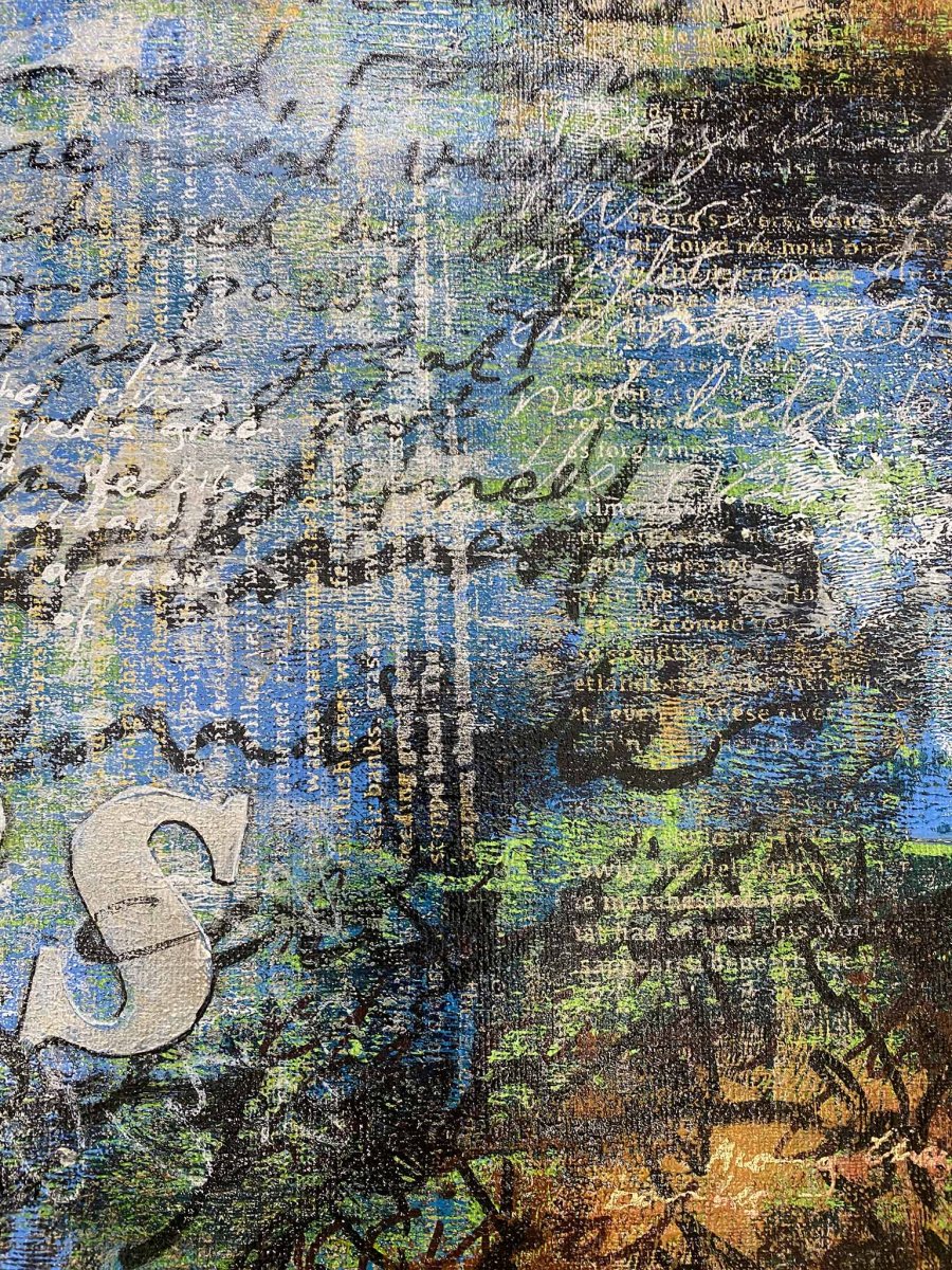 This painting reflects on Doggerland, the vast land that once connected Britain to continental Europe before it disappeared beneath the rising seas. This drowned landscape speaks not only of ancient history but also of our present time. Rising sea levels and climate change once again threaten coastlines, echoing the fate of this forgotten land. The work is layered with text in silver foil, ink, acrylic markers, and screen print. Words shimmer and fade depending on the light, just as memory and history shift between presence and absence. The reflective surfaces act like water: sometimes concealing, sometimes revealing. For me, Doggerland embodies both resilience and fragility. It was once a fertile corridor of life, later drowned by the unstoppable sea. In my work, I revisit this lost world not as a reconstruction, but as a mirror. What is drowned may return as a warning.