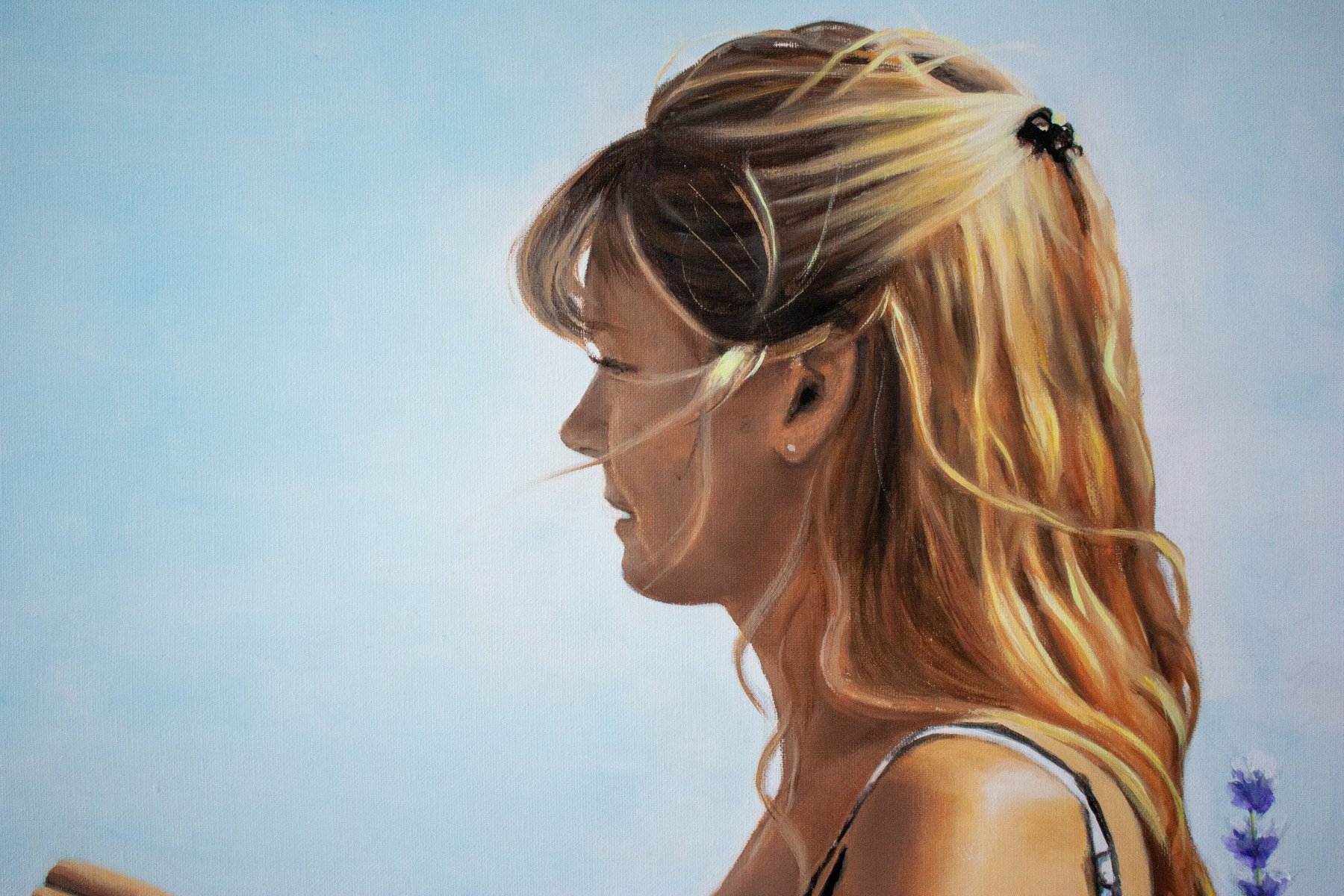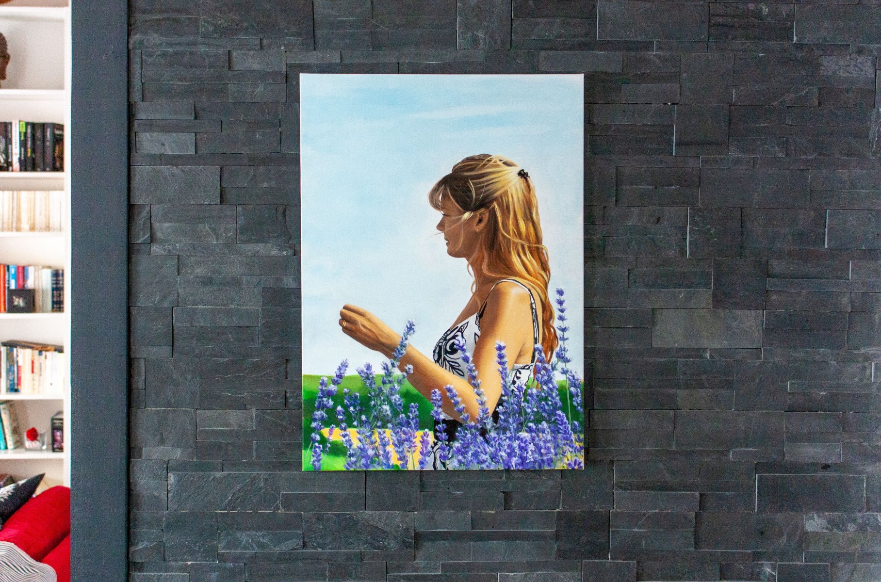 A young woman turns her back to the late afternoon sun in a lavender field. She is blonde, with long hair; she is wearing a black and white dress and is waving her hand, as if chasing a bee. In the foreground are lavenders in bloom. The scene is set on the Plateau d'Albion, in the Vaucluse region of Provence.