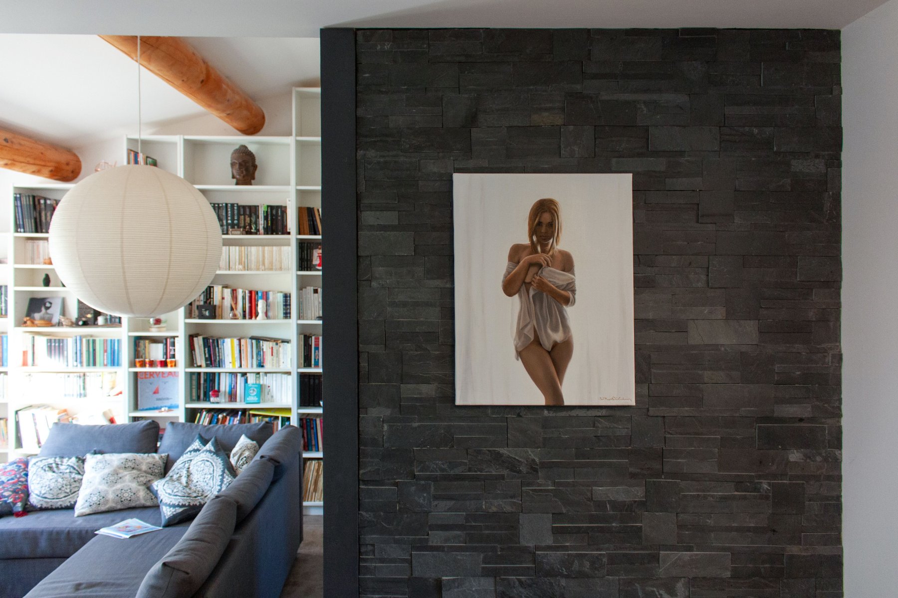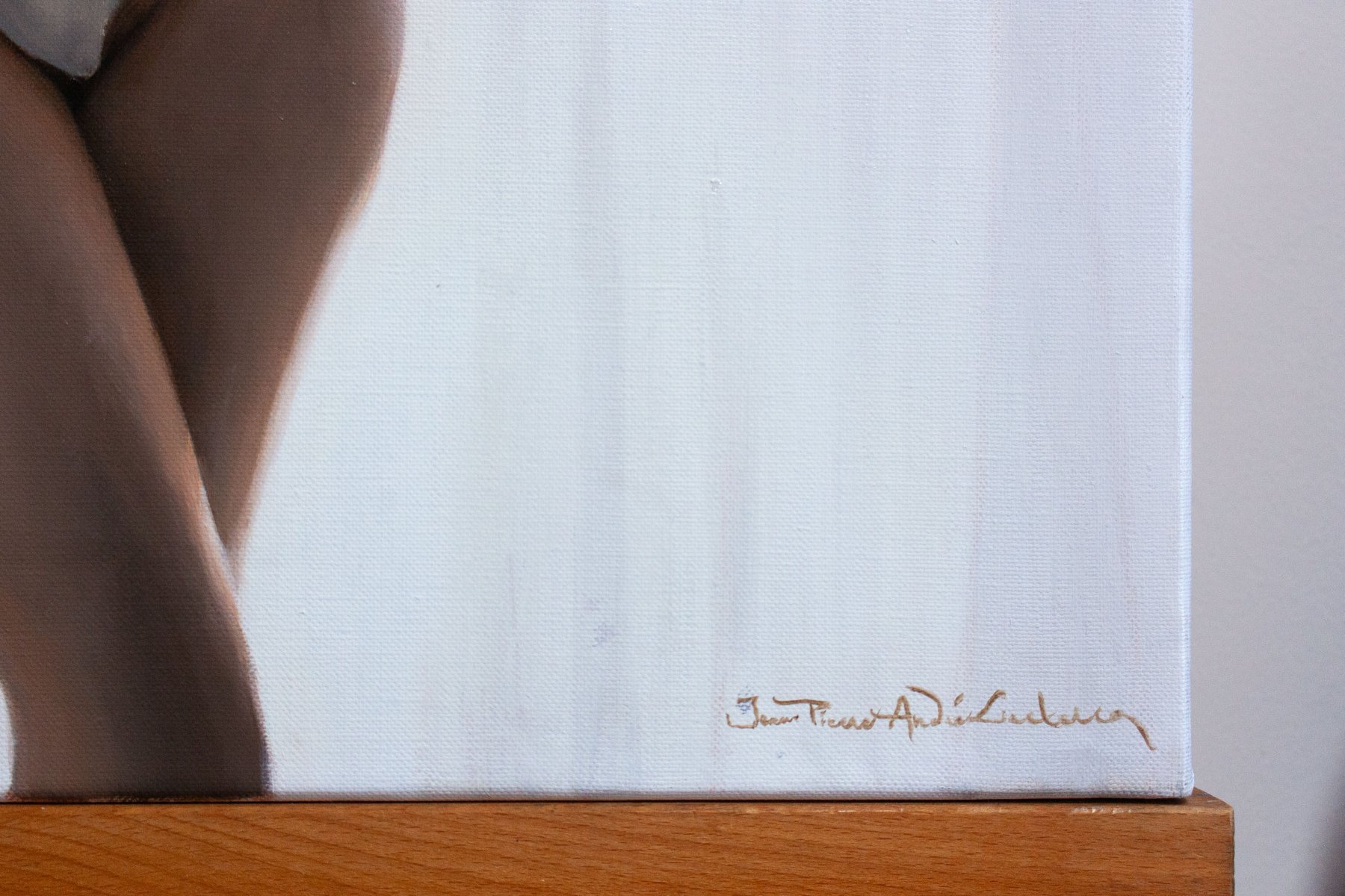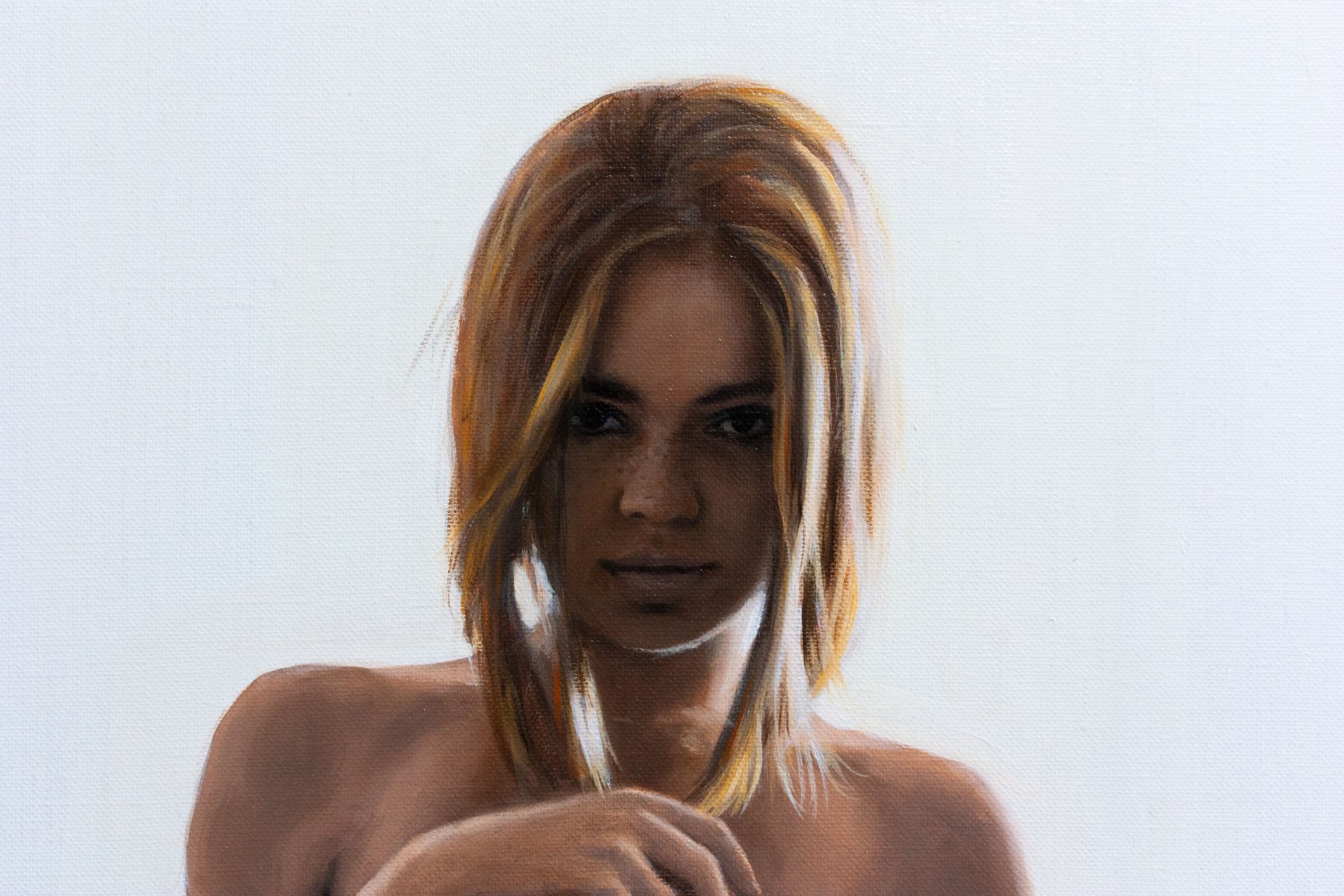 A young woman stands against the light in front of a veiled window. She is not completely naked, holding a fairly transparent blouse more or less closed and partially hiding her left breast with her arm. The light comes from the window behind the model.