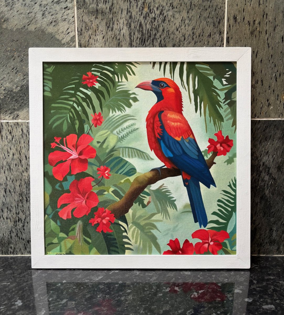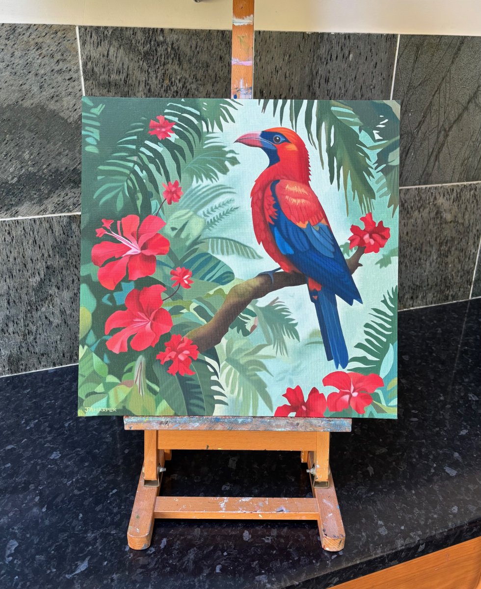This artwork is the second in a series of original oil paintings featuring tropical birds in jungle settings. Each one will focus on a particular colour; the six in the series will be pink, red, purple, yellow, orange and turquoise.