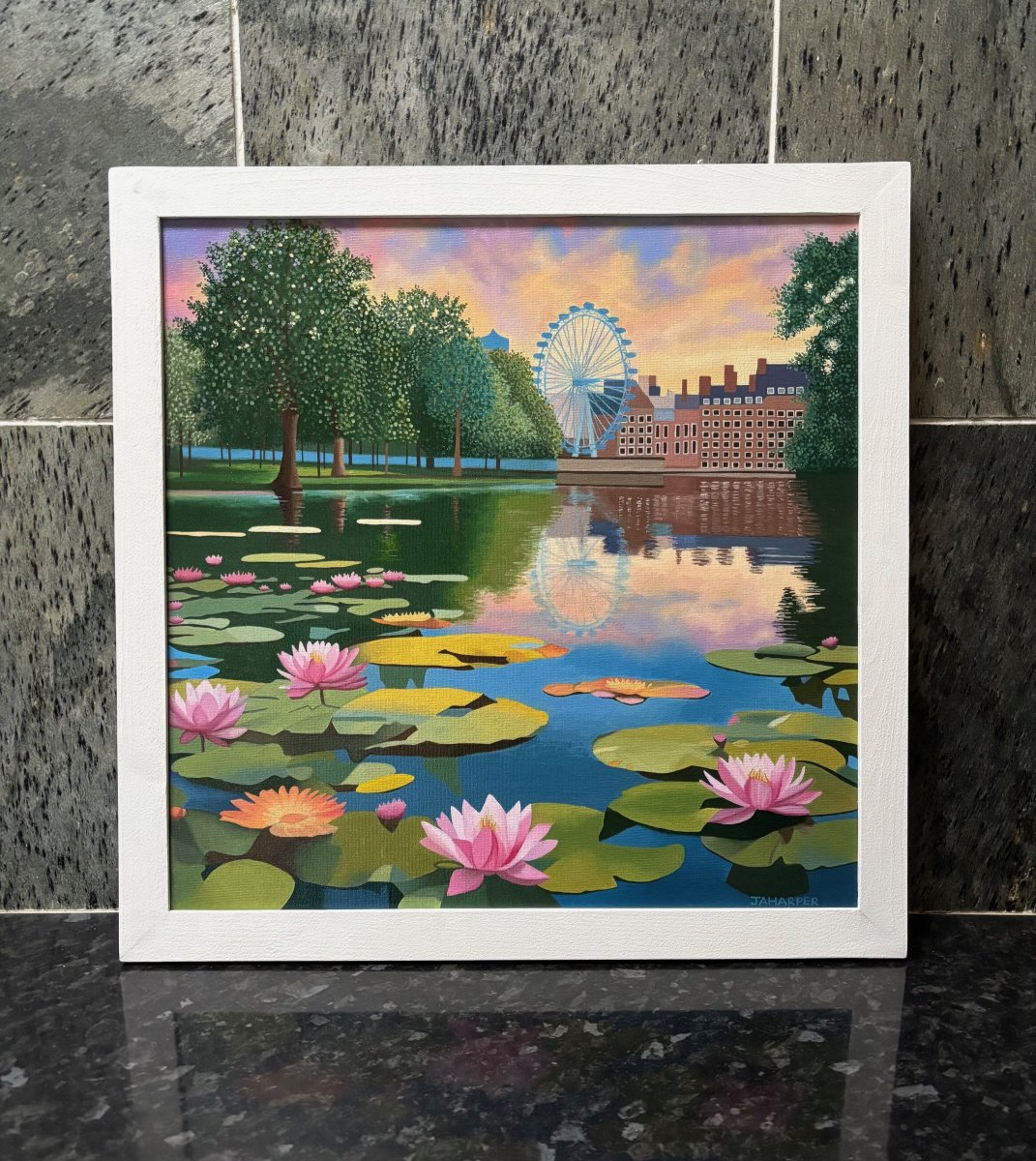 This painting has been produced using artist grade oil paint on canvas. A coat of professional grade art varnish has been applied to optimise the colour and protect the painting from dust, UV light and other environmental factors. The painting is provided in a complimentary handmade wooden frame which is painted white and fitted with picture wire, ready to hang. The painting is signed on the front and will be shipped with the Certificate of Authenticity.