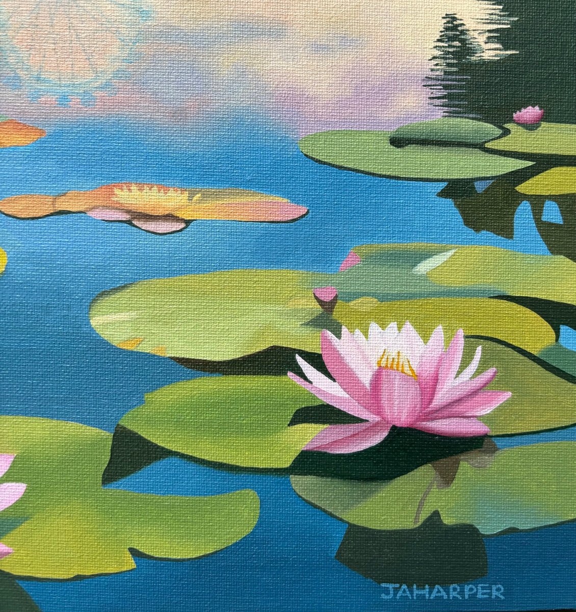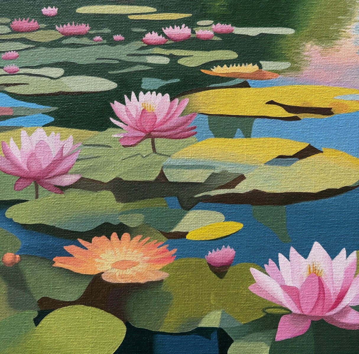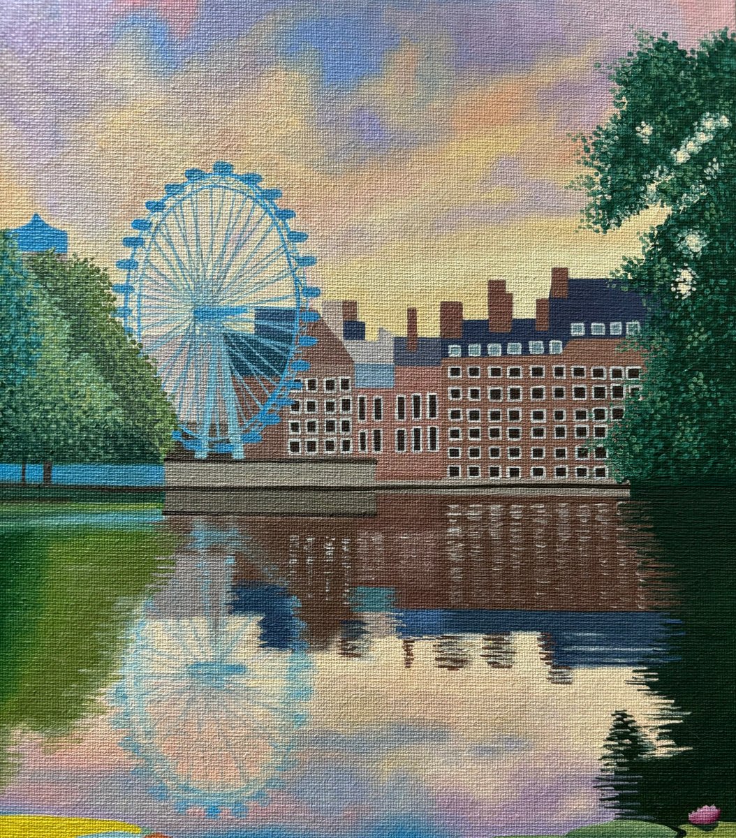 I’ve started a new body of work, combining the subjects of monuments and flowers within my paintings, as I enjoy painting both. I’m also employing a touch of surrealism to make the composition and colour palette more interesting. This is the first painting in the series.