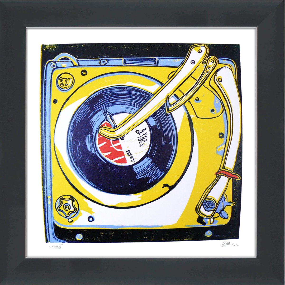 The black frame measures 35 cm x 35 cm x 2 cm deep. It has a wood effect finish and has a 2.7 cm moulding visible in the front view. The artwork is mounted in a deep bright white bevelled cut mount and is signed on the front.