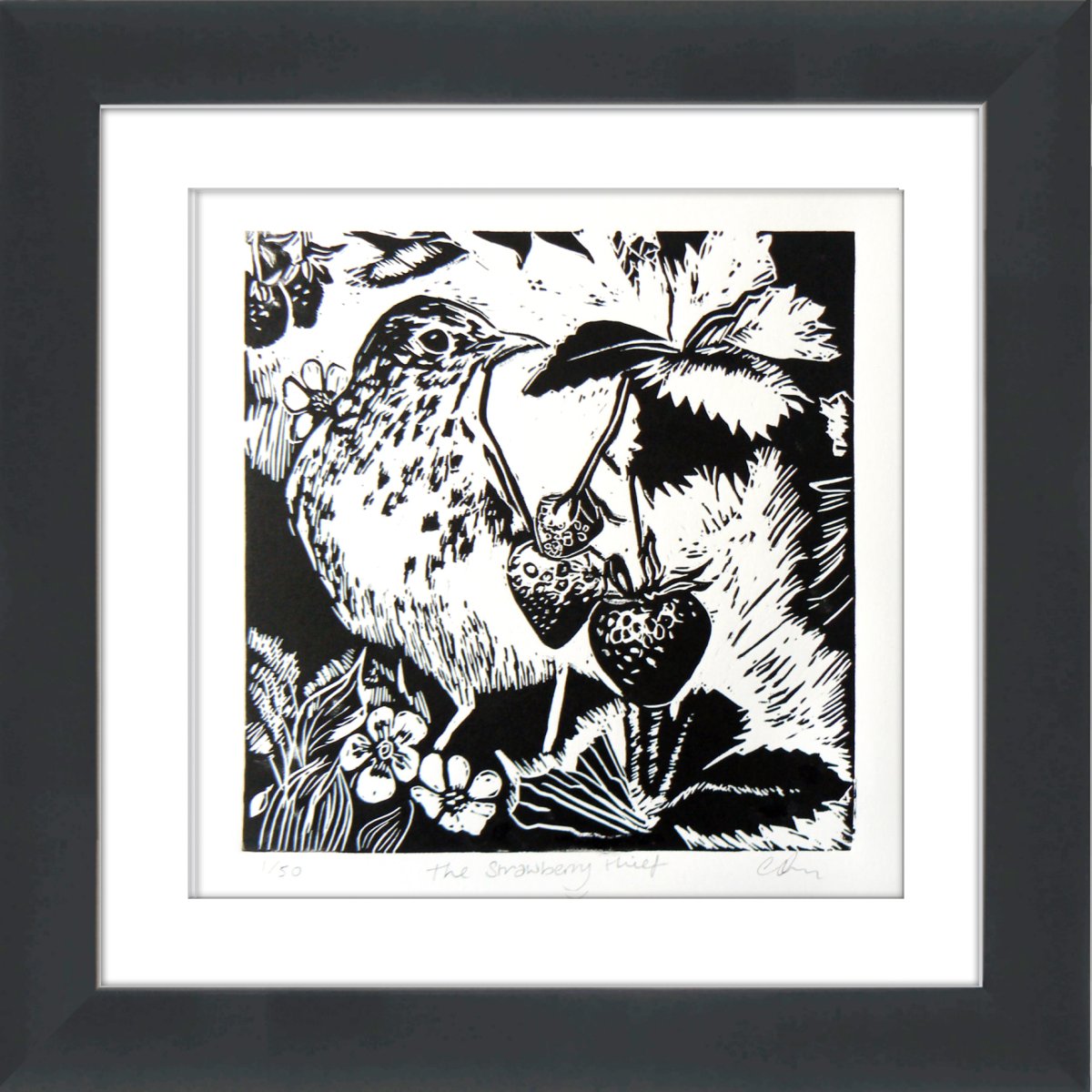 This print is a linocut of a thrush among strawberry plants, something I know as a keen gardener they and the blackbirds too love.
